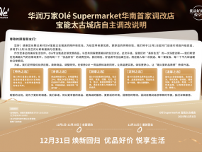 為給消費(fèi)者帶來(lái)更優(yōu)質(zhì)、舒心的購(gòu)物體驗(yàn),華潤(rùn)萬(wàn)家Olé Supermarket華南首家調(diào)改店——深圳寶能太古城店,將于12月1日起對(duì)門(mén)店進(jìn)...