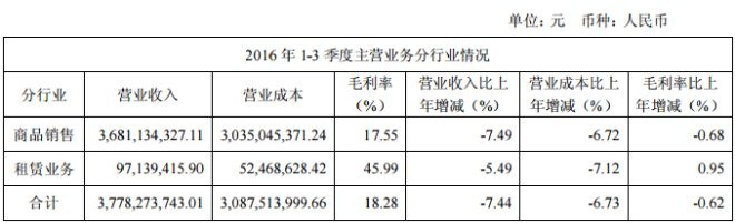 近日,北京翠微大廈股份有限公司發(fā)布2016第三季度報告。截至本報告期末,翠微股份擁有總資產(chǎn)51.02億元,末比上年度末增4.13%;歸屬于上市公司股東的凈資產(chǎn)28.87億元,將上年同期增長0.17%。 前9月,翠微股份實現(xiàn)營業(yè)收入38.84億元,比上期同降7.52%;歸屬于上市公司股東的凈利潤0.57億元,較上年同期下降38.79%。經(jīng)營活動產(chǎn)生的現(xiàn)金流量凈額1.31億元,較上年的1.45億元下降9.82%。單季營業(yè)收入11.92億元,同比下降3.3%;實現(xiàn)凈利潤0.11億元,同比下降42.88%,較二季度54.98%的降幅小幅改善。 ▲2016 年1-3季度,翠微股份商品銷售的營業(yè)收入36.81億元,毛利率為17.55%。 (本文來源/聯(lián)商網(wǎng)) |