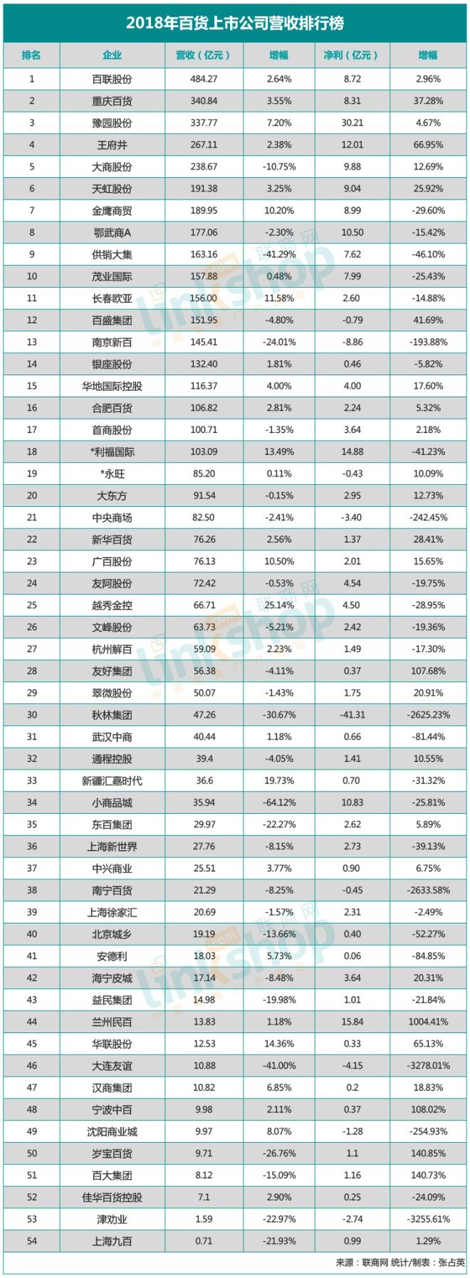 近日,《聯(lián)商網(wǎng)》大數(shù)據(jù)研究中心選取了國(guó)內(nèi)54家百貨上市公司的2018年財(cái)報(bào),從上市公司2018年業(yè)績(jī)及2019年計(jì)劃中,探尋百貨生存現(xiàn)狀及發(fā)展趨勢(shì)。 2018年位于榜單前十名的企業(yè)分別是百聯(lián)股份、重慶百貨、豫園股份、王府井、大商股份、天虹股份、金鷹商貿(mào)、鄂武商A、供銷大集以及茂業(yè)國(guó)際,與2017年排行榜略有不同,2017年榜單前十名是百聯(lián)股份、重慶百貨、供銷大集、大商股份、王府井、天虹股份、鄂武商A、南京新百、金鷹商貿(mào)、豫園商城,其中南京新百在2018年榜單排名中跌落至第13名。 備注: 1、圖表為不完全統(tǒng)計(jì),榜單按企業(yè)營(yíng)收排名,數(shù)據(jù)來源為各上市公司財(cái)報(bào); 2、圖表貨幣單位為人民幣,標(biāo)*為港元轉(zhuǎn)化為人民幣后的約值,匯率采用日期:2019年5月17日。 選取的54家門店中有27家企業(yè)營(yíng)收取得增長(zhǎng),其中越秀金控增幅最大,同比增長(zhǎng)25.14%,凈利潤(rùn)增長(zhǎng)的企業(yè)有27家,其中蘭州民百增長(zhǎng)1004.41%,取得凈利潤(rùn)最快增長(zhǎng),而2017年實(shí)現(xiàn)營(yíng)收增長(zhǎng)的企業(yè)有36家,凈利潤(rùn)上漲的而企業(yè)有33家; 有27家營(yíng)收出現(xiàn)不同程度下滑,其中小商品城營(yíng)收下滑最為嚴(yán)重,同比下降64.12%,而在榜單前10名中,大商股份、鄂武商A以及供銷大集營(yíng)收出現(xiàn)下滑;54家上市公司中凈利潤(rùn)下滑企業(yè)有27家,其中大連友誼下滑最為嚴(yán)重,同比下滑3278.01%,津勸業(yè)、南寧百貨、秋林集團(tuán)分別下滑3255.61%、2633.58%及2625.23%,而在榜單前10名中金鷹商貿(mào)、鄂武商A、供銷大集、茂業(yè)國(guó)際凈利潤(rùn)出現(xiàn)不同程度下滑。 2018年54家上市公司中出現(xiàn)營(yíng)收、凈利均上升的企業(yè)15家,榜單前5名中只有大商股份出現(xiàn)營(yíng)收下滑,而去年?duì)I收凈利上升企業(yè)有24家;營(yíng)收、凈利雙降的企業(yè)共計(jì)15家,去年則為10家。 (來源/聯(lián)商網(wǎng) 羅秀玲) |
