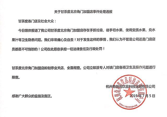 針對近日曝出的北京四家甘茶度因存在不同問題被立案調(diào)查事件,甘茶度方面作了回應(yīng)。 圖/截自甘茶度官網(wǎng) 據(jù)北京市市場監(jiān)督管理局消息,7月5日,北京市市場監(jiān)督管理局根據(jù)舉報,對北京市“甘茶度”飲品店開展監(jiān)督檢查。目前已對“甘茶度”旗下4家門店予以立案調(diào)查。 四家門店分別是甘茶度大紅門銀泰百貨店、甘茶度華聯(lián)購物中心店、甘茶度天虹商場新奧店、甘茶度飄亮陽光廣場店。 經(jīng)執(zhí)法人員現(xiàn)場調(diào)查后發(fā)現(xiàn):大紅門銀泰百貨店沒有自制飲品操作規(guī)程,食品安全信息公示欄中人員健康證明未及時更新,操作間水果(檸檬、橙子、蘋果)未隔墻離地存放,食品原材料進(jìn)貨臺帳記錄不完整,未能提供榨汁機(jī)等的消毒記錄;華聯(lián)購物中心店未獲得許可從事飲品制售,執(zhí)法人員現(xiàn)場責(zé)令其立即停止經(jīng)營;天虹商場新奧店存在腐敗變質(zhì)的食品原料(橙子),現(xiàn)場無法出示相關(guān)供應(yīng)商資質(zhì)、進(jìn)貨票據(jù)、臺賬、進(jìn)貨查驗記錄等問題;飄亮陽光廣場店有用于飲品制作的巧克力醬、稀奶油等過保質(zhì)期食品等問題。 截至目前,執(zhí)法人員已對“甘茶度”旗下在北京實際經(jīng)營的33家加盟店全部進(jìn)行了現(xiàn)場檢查,并對4家門店予以立案調(diào)查,責(zé)令這4家門店立即停止線上線下經(jīng)營活動。 隨后,甘茶度作了通報。 圖/甘茶度官網(wǎng) (來源/聯(lián)商網(wǎng)) |
