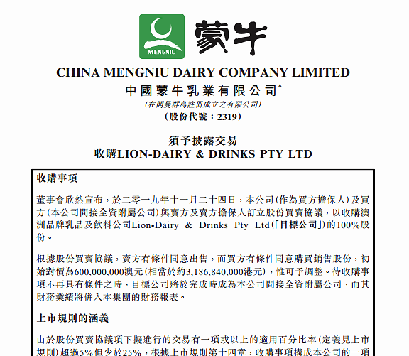 11月25日,蒙牛發(fā)布公告表示,以6億澳元(約32億人民幣)收購澳大利亞乳品和飲料公司Lion-Dairy & Drinks(以下簡稱LDD)。 據(jù)悉,LDD是澳大利亞第二大乳企,在澳大利亞、新加坡、馬來西亞、國內有2300名員工,擁有一系列高端液態(tài)奶和乳飲料瓶品牌、13個制造工廠,此次收購對于蒙牛掌控高品海外質奶源、提升自有冷鏈配送能力都有明顯助力。 公告顯示,LDD為于澳洲注冊成立的私人有限公司,此前為日本上市公司Kirin Holdings Company Limited的間接附屬公司。LDD主要從事生產(chǎn)及銷售其標志性的知名品牌乳品及飲料組合(包括奶類飲品、酸奶、白奶、低溫果汁及飲料、常溫果汁及飲料、沙冰、烹調及植物基產(chǎn)品),且LDD的若干產(chǎn)品品類于澳洲擁有領先市場地位。 另外,LDD于澳洲各地具有龐大的生產(chǎn)及冷鏈分銷能力,共有13個廠房設施,并擁有可觸達3.5萬名客戶的冷鏈分銷網(wǎng)絡。LDD通過酸奶產(chǎn)品于東南亞及國內等國際市場擁有一定的市場份額。 資料顯示,于2019年8月30日,LDD未經(jīng)審核備考經(jīng)調整合并資產(chǎn)總值及凈資產(chǎn)分別為48.28億港元及3.17億港元。 對于收購LDD的原因,蒙牛表示: 首先,由于該品牌在乳飲料、酸奶、低溫果汁及植物飲料之市場地位方面于澳洲排名第一,所以獲得目標公司優(yōu)質資產(chǎn)的控制權有利于打造區(qū)域性市場,實現(xiàn)多品類、多品牌的整合。同時可以通過這一渠道獲得大量高品質的澳洲奶源、大型制造設施以及龐大冷鏈分銷網(wǎng)絡,使目標集團成為澳洲全面垂直整合乳品公司。 其次,LDD具代表性、家喻戶曉的乳制品品牌組合在澳洲有悠久歷史,對一帶一路市場的消費者極具吸引力,能為蒙牛提供可觀的市場拓展機遇。最后,收購LDD有助于高端UHT奶的發(fā)展,并形成供應鏈的協(xié)同效應。 (來源/國內基金報 記者 李智) |
