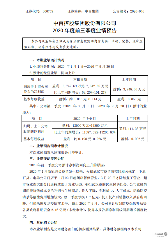 10月13日晚間,中百集團(tuán)2020年度前三季度業(yè)績(jī)預(yù)告顯示,中百集團(tuán)預(yù)計(jì)2020年前三季度歸屬于上市公司股東凈利潤(rùn)5742.69萬(wàn)元-7542.69萬(wàn)元,同比增長(zhǎng)53.2%-101.21%。其中,第三季度歸屬于上市公司股東的凈利潤(rùn)預(yù)計(jì)為1.3億元-1.48億元,同比增長(zhǎng)11587.55%-13205.83%。 公告中,中百集團(tuán)對(duì)于2020年前三季度公司預(yù)計(jì)凈利潤(rùn)同比上升歸因于收到各類政府補(bǔ)助資金2.16億元。 此前公布的半年報(bào)顯示,2020年上半年,中百實(shí)現(xiàn)營(yíng)業(yè)收入70.69億元,同比下降11.12%;歸屬上市公司股東的凈利潤(rùn)-0.73億元,同比下降299.52%。 (來(lái)源/聯(lián)商網(wǎng)) |