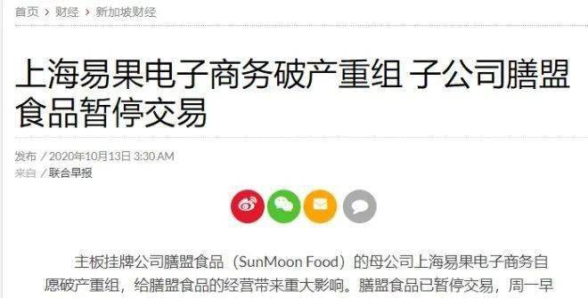 10月14日,記者從易果生鮮多位前員工處得到證實(shí),易果生鮮已進(jìn)行破產(chǎn)重組。13日,據(jù)新加坡聯(lián)合早報(bào)報(bào)道,易果生鮮(上海易果電子商務(wù)有限公司)、云象供應(yīng)鏈(上海云象供應(yīng)鏈管理有限公司)和安鮮達(dá)(上海安鮮達(dá)物流科技有限公司) 已于7月30日進(jìn)入自愿破產(chǎn)重組。 易果生鮮旗下新加坡公司膳盟食品發(fā)布的截至今年6月底財(cái)報(bào)顯示,所有與易果相關(guān)的個(gè)體(包括上述三家公司)欠集團(tuán)的應(yīng)收款項(xiàng)減去應(yīng)付帳款共計(jì)約1320萬新加坡元(約合人民幣6562.64萬元),其中來自上述三家公司的共為1240萬新加坡元(約6164.91萬元)。膳盟食品董事會認(rèn)為,易果生鮮、云象供應(yīng)鏈和安鮮達(dá)的破產(chǎn)重組會對集團(tuán)的繼續(xù)運(yùn)作造成重大影響。 報(bào)道稱,由于無法獲取中國法庭的文件,膳盟食品董事會無法評估破產(chǎn)重組的影響,目前的信息僅來源于公共領(lǐng)域,并未說明重組計(jì)劃的細(xì)節(jié)和理由。據(jù)了解,提交有關(guān)破產(chǎn)重組的債權(quán)人債權(quán)證明的截止日期是10月19日。針對經(jīng)營問題,膳盟食品董事會已探討解決各種途徑,包括向投資者融資等措施等。 附:易果生鮮發(fā)展歷程 2005年成立于上海。 2013年獲得阿里數(shù)千萬美元A輪戰(zhàn)略投資。 2014年阿里巴巴聯(lián)合云峰進(jìn)行B輪投資,后獲得天貓生鮮區(qū)運(yùn)營權(quán),訂單量增加400%。 2016年獲得阿里巴巴、KKR投資的C輪融資,融資金額2.6億美金。 2016年10月,新加坡健康食品公司SunMoon公布,其已接受中國生鮮電商易果的2400萬美元投資,并以每股4.5分的價(jià)格,配售3億3330萬股新股給易果,易果將擁有該公司51%股權(quán)。 2016年11月28日,易果生鮮正式對外宣布完成由蘇寧投資集團(tuán)領(lǐng)投的C+輪融資,融資總額超過5億美元。此次融資完成之后,易果生鮮和蘇寧將基于生鮮電商開展全方面的戰(zhàn)略合作,雙方將發(fā)揮各自優(yōu)勢做大做強(qiáng)2015年蘇寧超市推出的線上生鮮品牌蘇鮮生,同時(shí)為蘇寧小店供貨。 2016年12月,聯(lián)華超市發(fā)布公告稱,永輝超市12月23日與易果生鮮訂立股份轉(zhuǎn)讓協(xié)議,悉數(shù)轉(zhuǎn)讓其持有的21.17%聯(lián)華超市股份,轉(zhuǎn)讓價(jià)格約為8.5億元。而上述股權(quán)為永輝超市于2015年9月購入,當(dāng)時(shí)折合人民幣約7.51億元。 2017年8月,易果生鮮獲得天貓投資3億美元的D輪融資。 2018年12月,阿里巴巴組織架構(gòu)調(diào)整,易果生鮮將此前負(fù)責(zé)的貓超生鮮運(yùn)營轉(zhuǎn)交給盒馬鮮生。而易果生鮮則開始轉(zhuǎn)向B端,強(qiáng)化數(shù)字驅(qū)動(dòng)的生鮮全產(chǎn)業(yè)鏈協(xié)作平臺的定位,發(fā)揮供應(yīng)鏈、冷鏈物流的優(yōu)勢,以進(jìn)一步打通線上線下,推進(jìn)阿里生鮮全鏈能力,為盒馬、大潤發(fā)、天貓超市生鮮、餓了么等提供供應(yīng)鏈、冷鏈物流方面的支持。 2019年7月,與蘇寧快消集團(tuán)達(dá)成戰(zhàn)略合作,雙方擬在未來兩年內(nèi)將通過全面的生鮮供應(yīng)鏈領(lǐng)域合作,預(yù)計(jì)完成20億元的生鮮產(chǎn)品采購供應(yīng)鏈合作計(jì)劃。 2019年12月被上海長寧區(qū)法院列為被執(zhí)行人,執(zhí)行標(biāo)的為14110223元。 2019年12月,蘇寧智能聯(lián)合易果旗下云象供應(yīng)鏈共同投資成立一家云科技服務(wù)公司。其中,蘇寧智能為大股東,持股49%,云象商業(yè)持股31%。 2020年1月16日,易果生鮮運(yùn)營主體上海易果電子商務(wù)有限公司被上海長寧區(qū)法院凍結(jié)了股權(quán)和其他投資權(quán)益數(shù)額1029.72萬人民幣。 2020年10月14日,易果生鮮、云象供應(yīng)鏈和安鮮達(dá)已進(jìn)行破產(chǎn)重組。 (來源/聯(lián)商網(wǎng)) |