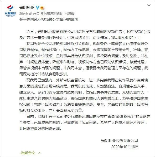 10月18日,上海市市場監(jiān)管局公布了光明乳業(yè)日前被罰30萬元的具體原因。 經(jīng)查,當事人通過官方網(wǎng)站對外發(fā)布含有“中國地圖”的《2016年-2020年光明乳業(yè)股份有限公司戰(zhàn)略規(guī)劃》視頻廣告。該廣告經(jīng)上海市規(guī)劃和自然資源局檢定,當事人發(fā)布廣告中使用的中國地圖,未將我國領土表示完整、準確。 光明乳業(yè)也發(fā)布說明稱:視頻制作方工作疏漏,未將我國領土表示完整、準確,公司已停止發(fā)布該視頻。網(wǎng)絡上關于公司接受行政處罰原因是發(fā)布廣告語“請給我光明”的言論完全失實。 |