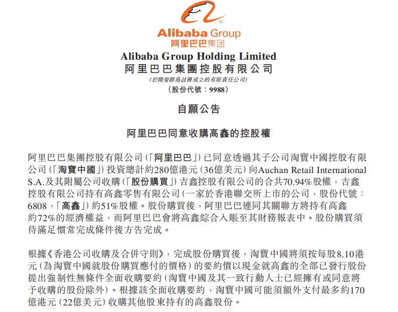 2020年10月19日 — 阿里巴巴集團(tuán)控股有限公司(紐交所代碼:BABA及港交所代碼︰9988,“阿里巴巴”)今日公布將斥資約280億港元,增持中國(guó)領(lǐng)先的商超運(yùn)營(yíng)商高鑫零售(港交所代碼︰6808,“高鑫”),交易完成后直接和間接共持有高鑫零售約72%1 股份。阿里巴巴集團(tuán)對(duì)高鑫的持續(xù)投入,將使其進(jìn)一步融合中國(guó)零售領(lǐng)域的線上線下資源,推進(jìn)新零售戰(zhàn)略。 根據(jù)買(mǎi)賣(mài)協(xié)議,阿里巴巴擬向Auchan Retail International S.A. 及其子公司(“歐尚零售”)一方收購(gòu)高鑫母公司吉鑫約70.94%股份,收購(gòu)對(duì)價(jià)約280億港元(36億美元),吉鑫持有高鑫的51%股份。交易完成后,阿里巴巴將并表高鑫的財(cái)務(wù)業(yè)績(jī)。黃明端在擔(dān)任高鑫零售首席執(zhí)行官的同時(shí),也獲委任為公司董事會(huì)主席。 阿里巴巴集團(tuán)董事會(huì)主席兼首席執(zhí)行官?gòu)堄卤硎荆骸鞍⒗锇桶?017年戰(zhàn)略投資高鑫零售,并與歐尚零售、潤(rùn)泰集團(tuán)達(dá)成戰(zhàn)略合作聯(lián)盟,這是我們新零售戰(zhàn)略布局中的重要一步,也為中國(guó)商超領(lǐng)域創(chuàng)造新機(jī)遇與新價(jià)值奠定了堅(jiān)實(shí)基礎(chǔ)。高鑫在首席執(zhí)行官黃明端的帶領(lǐng)下,與阿里巴巴數(shù)字經(jīng)濟(jì)體內(nèi)的各業(yè)務(wù)實(shí)現(xiàn)協(xié)同、推動(dòng)數(shù)字化升級(jí),取得了優(yōu)異成績(jī)。新冠疫情以來(lái),消費(fèi)者生活方式及企業(yè)運(yùn)營(yíng)的數(shù)字化發(fā)展提速。面對(duì)這一高度確定的大趨勢(shì),我們期待通過(guò)增持高鑫進(jìn)一步推動(dòng)新零售戰(zhàn)略,把握中國(guó)商超領(lǐng)域的發(fā)展機(jī)遇,為消費(fèi)者提供線上線下全面融合的消費(fèi)體驗(yàn)! 2017年11月,阿里巴巴集團(tuán)與歐尚零售、潤(rùn)泰啟動(dòng)新零售戰(zhàn)略合作,共同推進(jìn)高鑫門(mén)店數(shù)字化,包括全渠道融合及更個(gè)性化的消費(fèi)者體驗(yàn)。過(guò)去三年,高鑫藉助阿里巴巴經(jīng)濟(jì)體的資源與技術(shù),在快速變化的市場(chǎng)環(huán)境中成功實(shí)踐數(shù)字化轉(zhuǎn)型,把握了中國(guó)商超領(lǐng)域的發(fā)展先機(jī)。 截至目前,高鑫旗下所有門(mén)店均已接入與阿里巴巴的淘鮮達(dá)及天貓超市,為客戶(hù)提供“1小時(shí)達(dá)”及“半日達(dá)”及時(shí)配送消費(fèi)體驗(yàn),并與阿里巴巴經(jīng)濟(jì)體的多個(gè)核心業(yè)務(wù)緊密協(xié)作,包括餓了么、菜鳥(niǎo)網(wǎng)絡(luò)等,為消費(fèi)者提供更多的商品選擇及更便捷的服務(wù)體驗(yàn)。截至今年6月底,高鑫零售于中國(guó)共有481家大賣(mài)場(chǎng)及3家中型超市,未來(lái)將加強(qiáng)小型化和社區(qū)化線下店鋪布局。 |