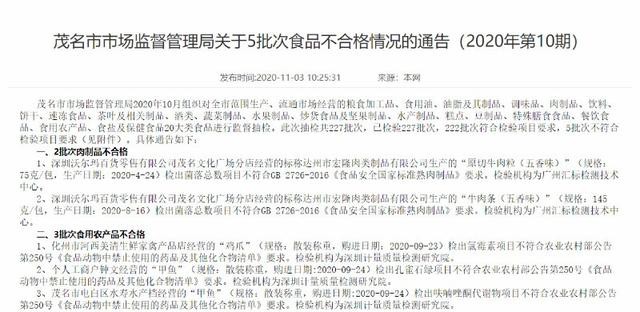 11月4日訊 11月3日,茂名市市場(chǎng)監(jiān)督管理局網(wǎng)站發(fā)布關(guān)于5批次食品不合格情況的通告(2020年第10期)。通告顯示,茂名市市場(chǎng)監(jiān)督管理局10月對(duì)糧食加工品、食用油等20大類(lèi)共227批次食品進(jìn)行了監(jiān)督抽檢,其中5批次不合格,包含2批次肉制品和3批次食用農(nóng)產(chǎn)品。 圖源:茂名市市場(chǎng)監(jiān)督管理局網(wǎng)站 其中,2批次肉制品“原切牛肉粒(五香味)”和“牛肉條(五香味)”不合格項(xiàng)目為菌落總數(shù),均為達(dá)州市宏隆肉類(lèi)制品有限公司生產(chǎn)、深圳沃爾瑪百貨零售有限公司茂名文化廣場(chǎng)分店銷(xiāo)售。 天眼查顯示,深圳沃爾瑪百貨零售有限公司為沃爾瑪(中國(guó))投資有限公司全資子公司,該企業(yè)近年來(lái)有多次被當(dāng)?shù)厥袌?chǎng)監(jiān)管、食品藥品監(jiān)管等部門(mén)處罰的記錄。 (來(lái)源/中國(guó)網(wǎng)) |
