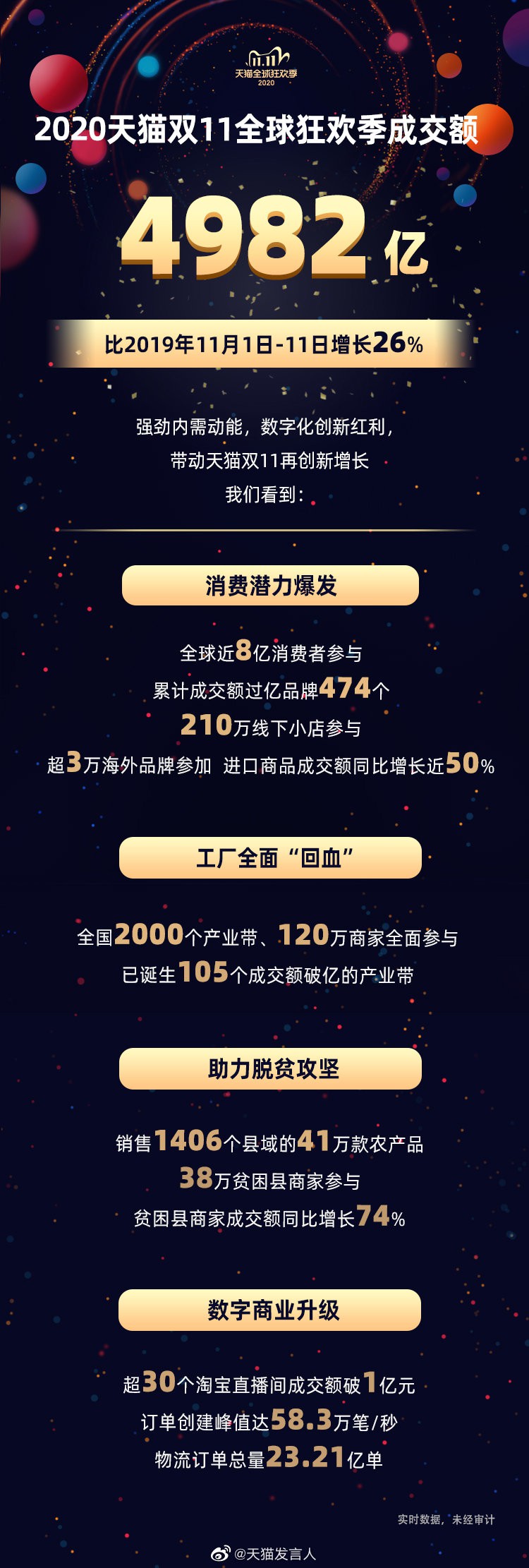 據(jù)官方數(shù)據(jù),2020天貓“雙11”全球狂歡季成交額達(dá)到4982億,超過450個(gè)品牌成交額過億。實(shí)時(shí)物流訂單量突破22.5億單,約等于2010年全年中國快遞量的總和。 淘寶天貓總裁蔣凡透露,按照同周期、同口徑比較,今年雙11期間的GMV比去年同期增長了1032億,增速是26%,這是過去三年來最高的增速。 據(jù)介紹,截至目前,共有31766個(gè)海外品牌、210萬線下小店參與本次雙十一,105個(gè)產(chǎn)業(yè)帶成交額過1億元。 天貓方面預(yù)計(jì),今年天貓雙11吸引超過8億消費(fèi)者、25萬品牌、500萬商家共同參與,是覆蓋面最廣、參與度最高的一屆。更長的銷售周期給 |