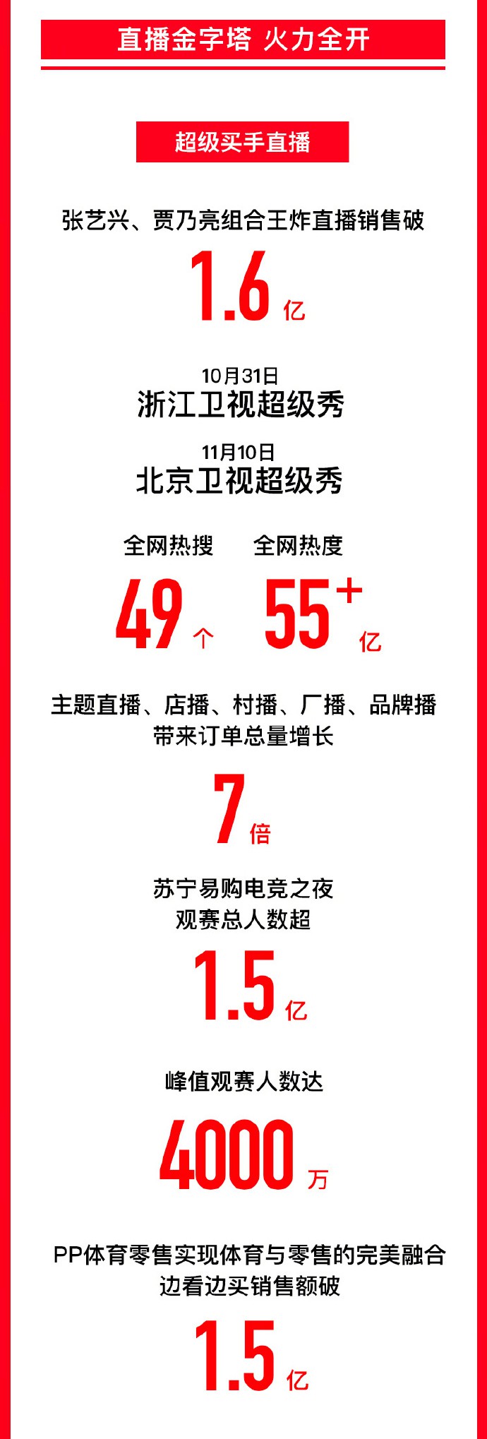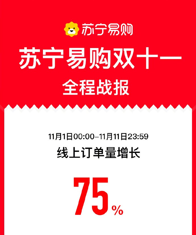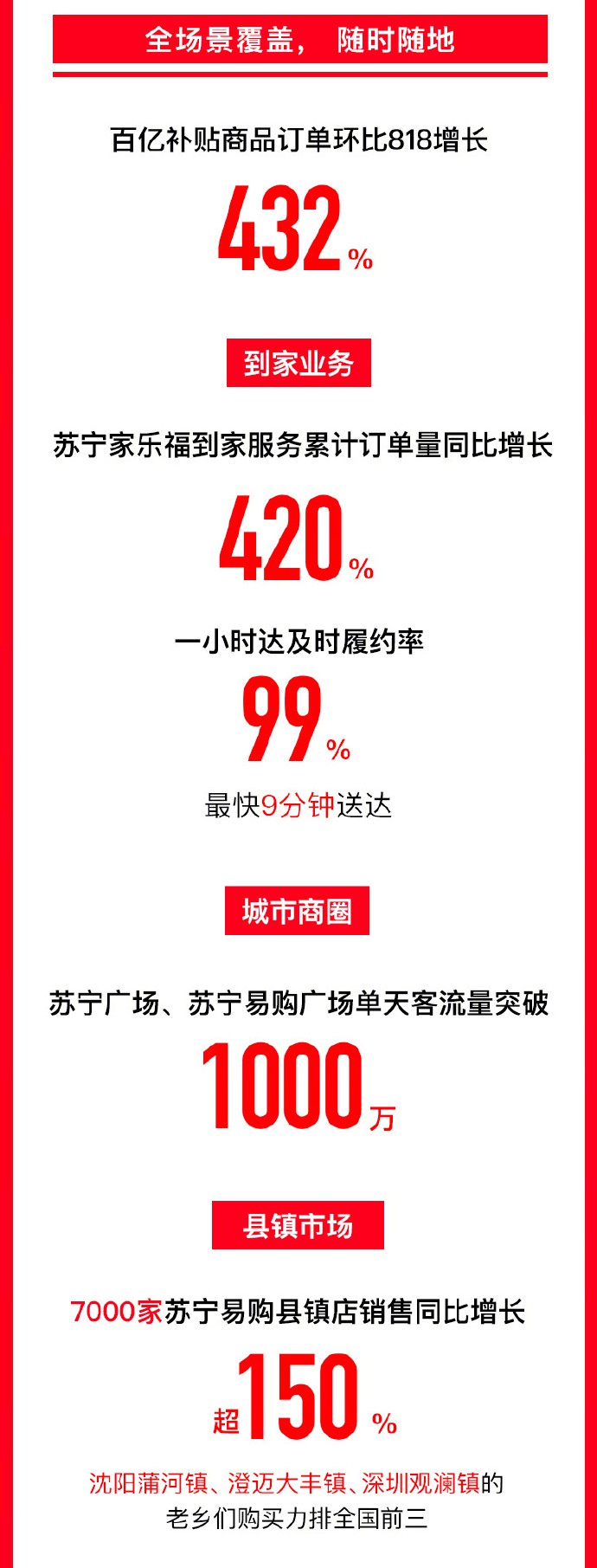 今年雙十一,依舊是全場景的狂歡。11月12日0點,蘇寧易購發(fā)布全程戰(zhàn)報,11月1日至11日23點59分,雙十一線上訂單量增長75%。家樂福到家服務(wù)訂單量同比增420%。雙十一期間,蘇寧易購百億補貼首入線下,達成社區(qū)、縣鎮(zhèn)、商圈等場景全面覆蓋。 隨時業(yè)務(wù)方面,蘇寧家樂福到家服務(wù)訂單量同比增長420%,一小時達及時履約率99%,最快配送時間僅用時9分鐘。下沉市場,7000家蘇寧縣鎮(zhèn)店雙十一當(dāng)天銷售增長150%,沈陽蒲河鎮(zhèn)、澄邁大豐鎮(zhèn)、深圳觀瀾鎮(zhèn)的老鄉(xiāng)們購買力排全國前三。 雙十一當(dāng)天,在各大城市商圈,蘇寧廣場、蘇寧易購廣場客流量突破1150萬。線下消費在這個雙十一迎來全面復(fù)蘇。 |