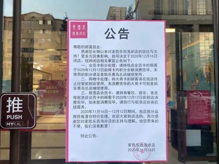 11月16日,黃島麥凱樂商場宣布決定于2020年12月16日閉店。 公告顯示,受多方因素影響,麥凱樂西海岸店決定于2020年12月16日閉店。持有該店會員卡的顧客于2020年12月12日前將卡內積分余額消費完畢,未使用的積分至麥凱樂青島總店繼續(xù)使用。 此外,公告內容顯示,持大商卡的顧客在西海岸店終止經營前到店使用,未消費完畢的大商卡可到麥凱樂青島總店繼續(xù)使用。持有餐飲、娛樂、美發(fā)等租賃店會員卡的顧客于2020年12月12日前到店消費完畢,如未能消費完畢,請自行與租賃店協(xié)商后續(xù)服務。據悉,2020年11月16日——12月12日期間,西海岸店部分品牌將做清倉特價處理。 公開資料顯示,麥凱樂是大商集團的新商號,起于日本,發(fā)展于大連,成功于大商,定位于高檔精品流行百貨。自2004年組建麥凱樂連鎖集團以來,在青島先后開設了麥凱樂青島總店、麥凱樂西海岸店、麥凱樂新都心店。其中,麥凱樂新都心店于2018年4月正式閉店,其門店已于2019年初被保利所接手。 本次發(fā)布閉店公告的麥凱樂西海岸店,于2011年3月25日正式開業(yè),經營已近10年。作為一站式時尚休閑高級百貨店,該商場建筑面積5萬平方米,主力客層定位于18-45歲、向往時尚高品質生活的青中年精英人群及家庭消費群體。匯集有精品超市、銘品街、時尚男女服裝、珠寶、鞋包配飾、兒童用品、居住生活品、運動名品、家電、美食廣場、美容美發(fā)、兒童淘氣堡等多元化業(yè)態(tài),其首次引入西海岸新區(qū)的獨有品牌高達176家。 |