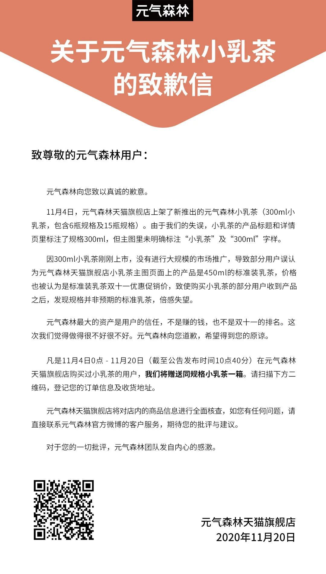 11月4日,元氣森林天貓旗艦店上架了新推出的小乳茶(300ml,包含6瓶規(guī)格及15瓶規(guī)格)。元氣森林在小乳茶的產(chǎn)品標(biāo)題和詳情頁里標(biāo)注了規(guī)格300ml,但主圖里未明確標(biāo)注“小乳茶”及“300ml”字樣。 20日,針對此前上架的“小乳茶”產(chǎn)品沒有在主圖中標(biāo)注詳細規(guī)格一事,元氣森林官微發(fā)布致歉信。 元氣森林稱,因300ml小乳茶剛剛上市,沒有進行大規(guī)模的市場推廣,導(dǎo)致部分用戶誤認為天貓旗艦店小乳茶主圖頁面上的產(chǎn)品是450ml的標(biāo)準(zhǔn)裝乳茶,價格也被認為是標(biāo)準(zhǔn)裝乳茶雙十一優(yōu)惠促銷價,致使購買小乳茶的部分用戶收到產(chǎn)品之后,發(fā)現(xiàn)規(guī)格并非預(yù)期的標(biāo)準(zhǔn)乳茶。 記者在元氣森林官方旗艦店發(fā)現(xiàn),的確有消費者在評論中質(zhì)疑小乳茶容量的問題,目前小乳茶產(chǎn)品主圖中已經(jīng)標(biāo)注與常規(guī)的450ml乳茶產(chǎn)品的規(guī)格差異。 元氣森林表示,此次因工作失誤造成用戶困擾,元氣森林向所有購買小乳茶的用戶致以深切的歉意。凡是11月4日0時-11月20日(截至公告發(fā)布時間10時40分)在其天貓旗艦店購買過小乳茶的用戶,元氣森林將贈送同規(guī)格小乳茶一箱。 |