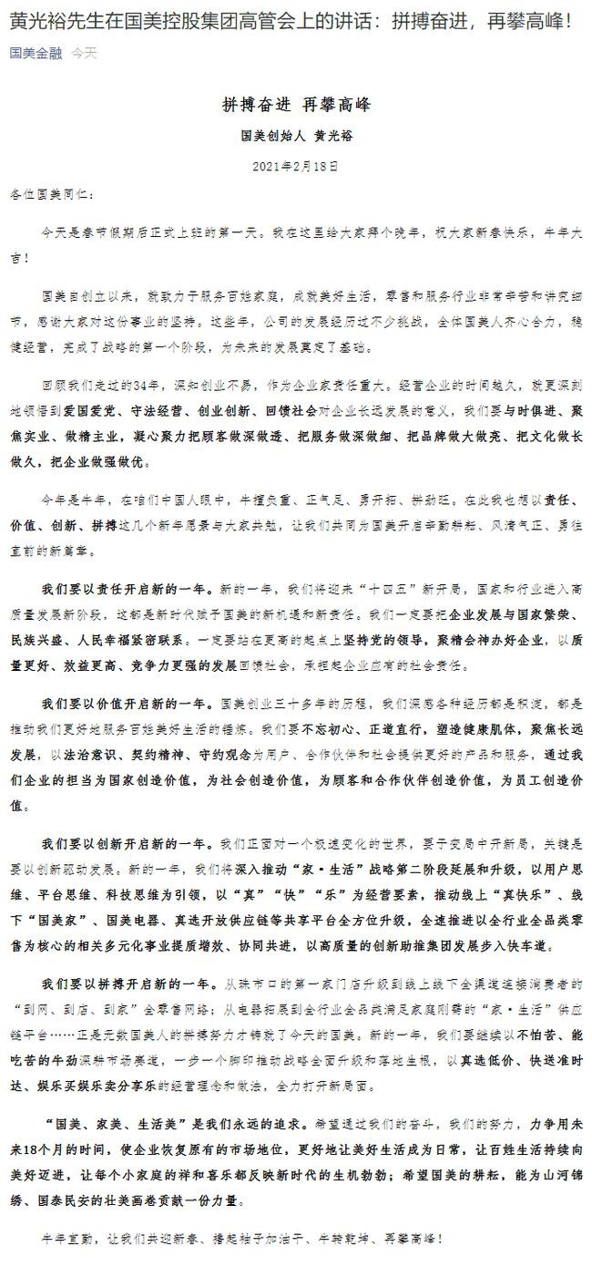 2月18日消息,國美創(chuàng)始人黃光裕在國美控股集團高管會上發(fā)表講話稱,力爭用未來18個月的時間,使企業(yè)恢復(fù)原有的市場地位。 黃光裕表示,新的一年將深入推動“家·生活”戰(zhàn)略第二階段延展和升級,以用戶思維、平臺思維、科技思維為引領(lǐng),以“真”“快”“樂”為經(jīng)營要素,推動線上“真快樂”、線下“國美家”、國美電器、真選開放供應(yīng)鏈等共享平臺全方位升級,全速推進以全行業(yè)全品類零售為核心的相關(guān)多元化事業(yè)提質(zhì)增效、協(xié)同共進,以高質(zhì)量的創(chuàng)新助推集團發(fā)展步入快車道。 |