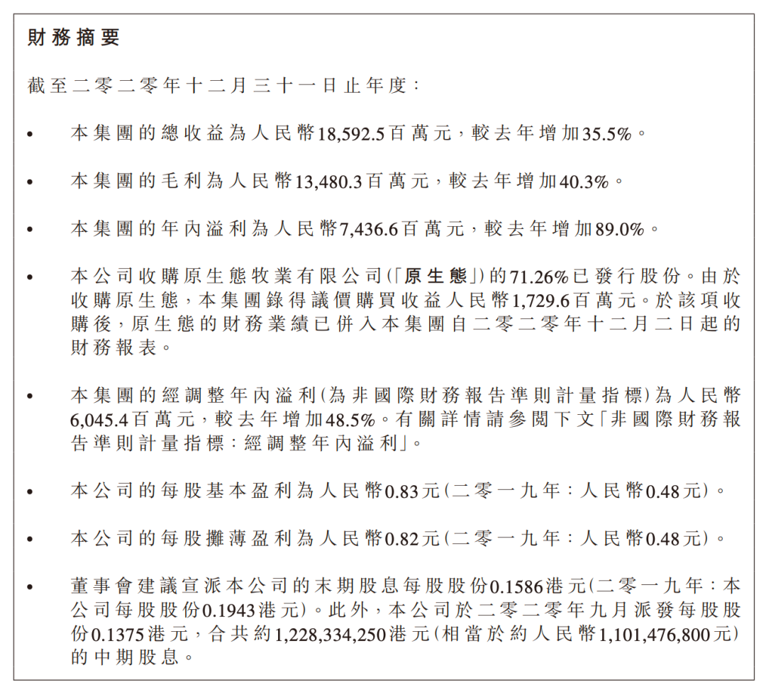 | 3月18日晚間,奶粉生產(chǎn)商中國(guó)飛鶴公布2020年業(yè)績(jī),顯示去年實(shí)現(xiàn)營(yíng)收185.93億元,增長(zhǎng)35.5%。凈利潤(rùn)74.38億元,增長(zhǎng)89%。 |