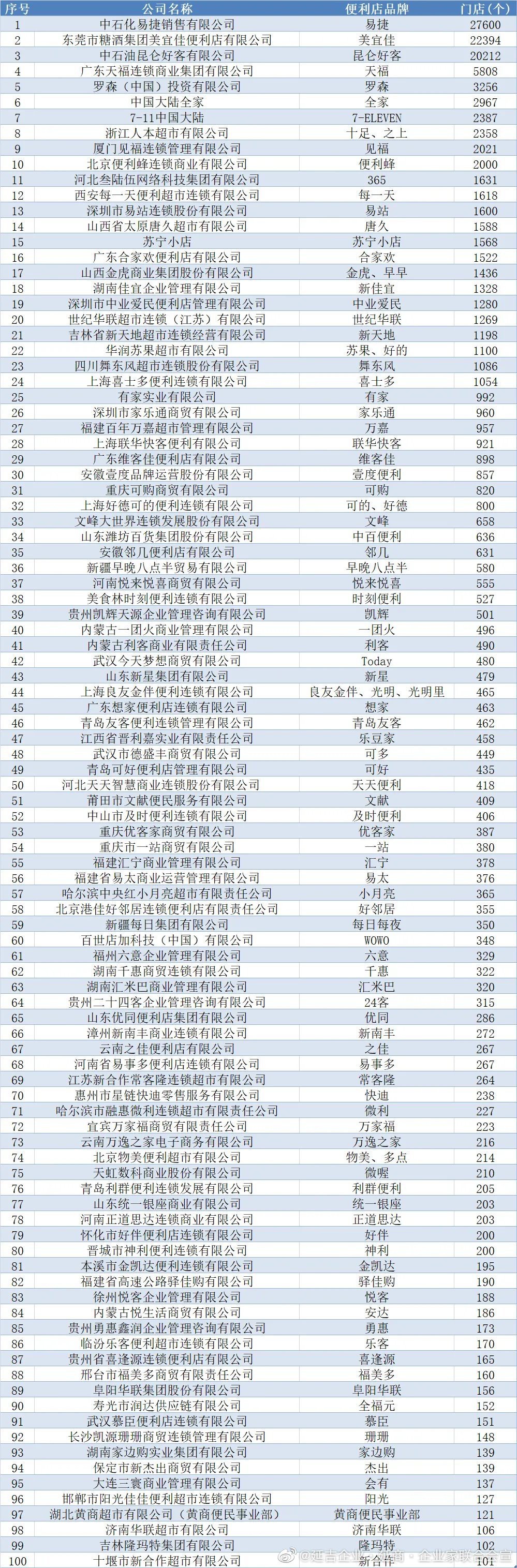 4月27日,中國(guó)連鎖經(jīng)營(yíng)協(xié)會(huì)(CCFA)發(fā)布《2021年中國(guó)便利店TOP100榜單》。其中,易捷繼續(xù)蟬聯(lián)榜首,門店總數(shù)27600家;美宜佳也繼續(xù)位居第二位,門店總數(shù)22394家;昆侖好客位居第三位,門店總數(shù)20212家。 值得一提的是,羅森以3256家門店超越全家(2967家)成為外資便利店之王,名列總榜單第五位。 |