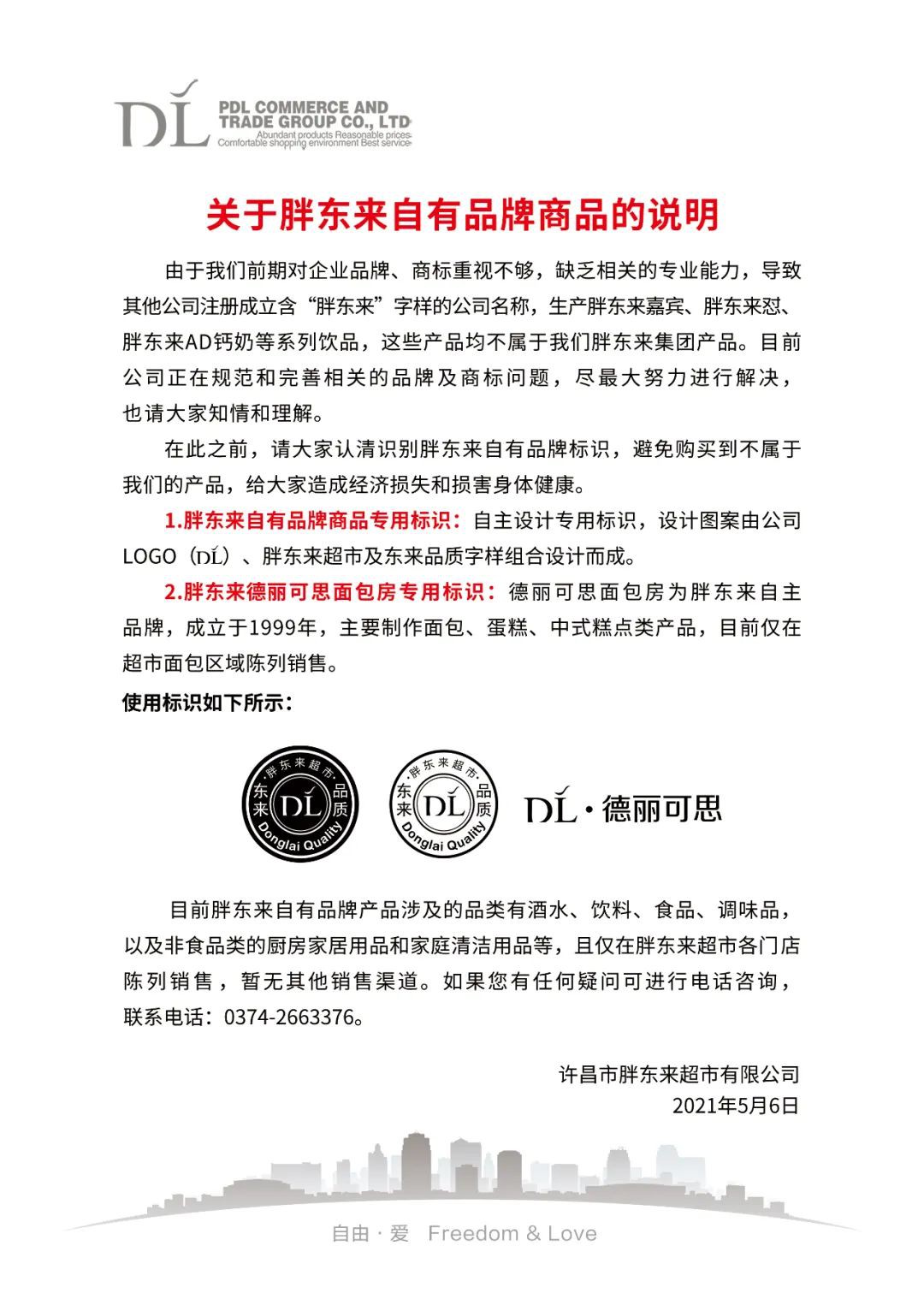 5月6日,胖東來發(fā)布《關于胖東來自有品牌商品的說明》。 說明稱,由于我們前期對企業(yè)品牌、商標重視不夠,缺乏相關的專業(yè)能力,導致其他公司注冊成立含“胖東來”字樣的公司名稱,生產胖東來嘉賓、胖東來懟、胖東來AD鈣奶等系列飲品,這些產品均不屬于我們胖東來集團產品。目前公司正在規(guī)范和完善相關的品牌及商標問題,盡最大努力進行解決,也請大家知情和理解。 在此之前,請大家認清識別胖東來自有品牌標識,避免購買到不屬于我們的產品,給大家造成經濟損失和損害身體健康。 1.胖東來自有品牌商品專用標識:自主設計專用標識,設計圖案由公司LOGO(DL)、胖東來超市及東來品質字樣組合設計而成。 2.胖東來德麗可思面包房專用標識:德麗可思面包房為胖東來自主品牌,成立于1999年,主要制作面包、蛋糕、中式糕點類產品,目前僅在超市面包區(qū)域陳列銷售。 使用標識如下所示: 目前胖東來自有品牌產品涉及的品類有酒水、飲料、食品、調味品,以及非食品類的廚房家居用品和家庭清潔用品等,且僅在胖東來超市各門店陳列銷售,暫無其他銷售渠道。 |