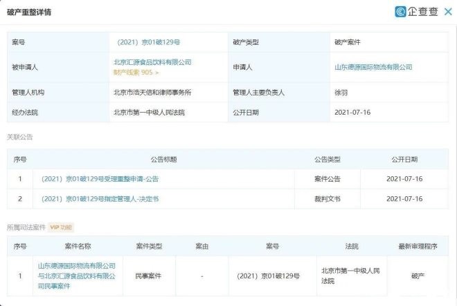 企查查APP顯示,北京匯源食品飲料有限公司新增破產(chǎn)重整信息,案號(hào)為(2021)京01破129號(hào),申請(qǐng)人為山東德源國(guó)際物流有限公司,經(jīng)辦法院為北京市第一中級(jí)人民法院。 此外,企查查顯示,7月2日,匯源被強(qiáng)制執(zhí)行超15億元。 公開(kāi)資料顯示,北京匯源飲料食品集團(tuán)有限公司成立于2001年6月,注冊(cè)資本約8.3億人民幣,法定代表人為朱燕彤。經(jīng)營(yíng)范圍含銷售包裝食品、飲料;果蔬種植;技術(shù)服務(wù)等。 股東信息顯示,該公司由河北匯源食品飲料有限公司全資持股。北京匯源食品飲料有限公司已有數(shù)十則終本案件、限制消費(fèi)令等。 匯源食品擁有北京、上海等分公司5家、全資子公司9家、參股公司3家。 |