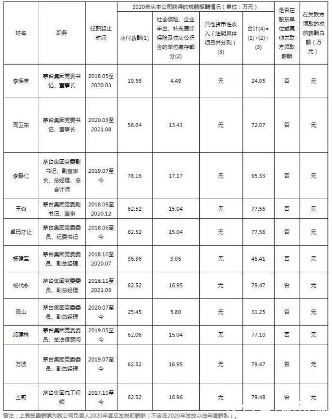 日前,貴州茅臺集團官網公布《中國貴州茅臺酒廠(集團)有限責任公司2020年度負責人薪酬情況公告》。 公告顯示,李保芳2020年從本公司獲得的稅前報酬總計為24.05萬元,高衛(wèi)東為72.07萬元,李靜仁為95.33萬元。 |