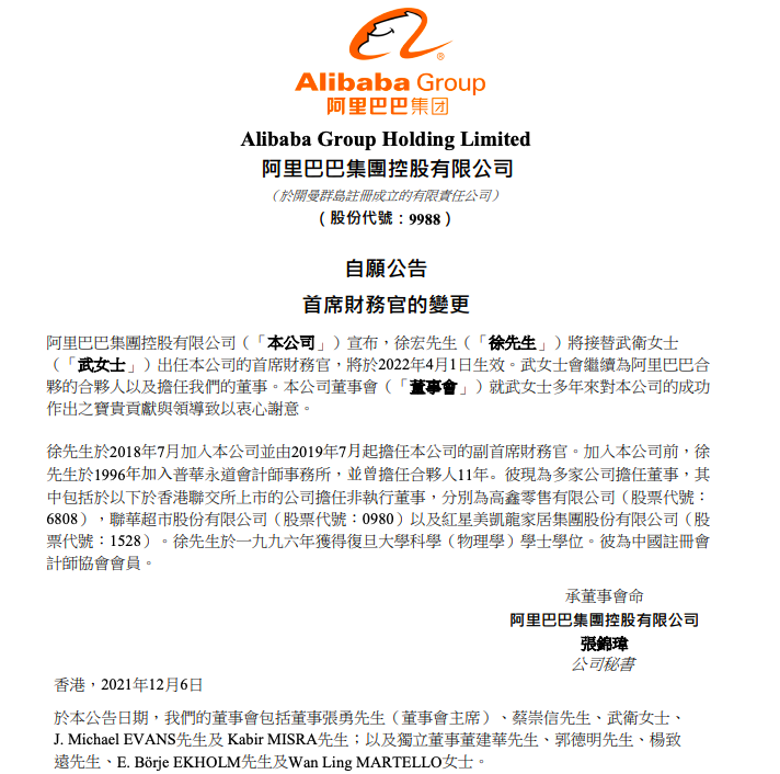 12月6日,阿里巴巴董事會主席兼CEO張勇發(fā)出內(nèi)部信,宣布公司升級“多元化治理”體系,任命戴珊和蔣凡分別負(fù)責(zé)新設(shè)立的“中國數(shù)字商業(yè)”和“海外數(shù)字商業(yè)”兩大板塊。 戴珊作為集團總裁,將代表阿里巴巴集團分管大淘寶(包括淘寶、天貓、阿里媽媽),B2C零售事業(yè)群,淘菜菜,淘特和1688等業(yè)務(wù),共同形成“中國數(shù)字商業(yè)板塊”。 蔣凡作為集團總裁,將代表阿里巴巴集團分管全球速賣通和國際貿(mào)易(ICBU) 兩個海外業(yè)務(wù),以及Lazada等面向海外市場的多家子公司,共同形成“海外數(shù)字商業(yè)板塊”。 阿里同時宣布,武衛(wèi)將從2022年3月31日起不再擔(dān)任集團首席財務(wù)官(CFO),屆時由集團副首席財務(wù)官(副CFO)徐宏(Toby)接任,武衛(wèi)將繼續(xù)擔(dān)任集團執(zhí)行董事,并擔(dān)任集團董事會下設(shè)的可持續(xù)發(fā)展委員會成員。 |