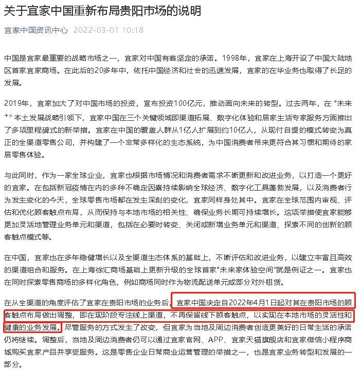 中國是宜家最重要的戰(zhàn)略市場之一,宜家對中國有著堅定的承諾。1998年,宜家在上海開設(shè)了中國大陸地區(qū)首家宜家商場。在此后的20多年中,依托中國經(jīng)濟和社會的迅速發(fā)展,宜家的在華業(yè)務(wù)也取得了長足的發(fā)展。 2019年,宜家加大了對中國市場的投資,宣布投資100億元,推動面向未來的轉(zhuǎn)型。過去兩年,在 “未來+” 本土發(fā)展戰(zhàn)略引領(lǐng)下,宜家中國在三個關(guān)鍵領(lǐng)域即渠道拓展、數(shù)字化體驗和居家生活專家服務(wù)方面推出了多項里程碑式的新舉措。宜家在中國的覆蓋人群從1億人擴展到約10億人,從現(xiàn)付自提的模式轉(zhuǎn)變?yōu)檎嬲娜懒闶酃,并?gòu)建了一個非常多樣化的生態(tài)系統(tǒng),為中國消費者帶來更符合其習慣和期待的家居零售體驗。 與此同時,作為一家全球企業(yè),宜家也根據(jù)市場情況和消費者需求不斷更新和改進業(yè)務(wù),以打造一個更好的宜家。在包括新冠疫情在內(nèi)的多種不確定因素持續(xù)影響全球經(jīng)濟、數(shù)字化工具蓬勃發(fā)展,以及消費者行為發(fā)生變化的今天,全球零售市場都在發(fā)生深刻的變化,宜家同樣身處其中。宜家在全球范圍內(nèi)審視、評估和優(yōu)化顧客觸點布局,從而保持與本地市場的相關(guān)性、確保業(yè)務(wù)長期可持續(xù)增長。這項舉措使宜家能夠更加靈活地管理業(yè)務(wù)單元和渠道,包括在必要時轉(zhuǎn)變、關(guān)閉或新增業(yè)務(wù)單元和渠道、探索不同的創(chuàng)新的顧客觸點模式等。 在中國,宜家也在多年穩(wěn)健增長以及全渠道生態(tài)體系的基礎(chǔ)上,不斷評估和改進業(yè)務(wù),以建立豐富且高效的渠道組合和服務(wù)。在上海徐匯商場基礎(chǔ)上更新升級的全球首家“未來家體驗空間”就是例證之一。宜家也在同時探索零售商場的多樣化角色,例如商場同時作為物流配送單元或部分對外租賃。 在從全渠道的角度評估了宜家在貴陽市場的業(yè)務(wù)后,宜家中國決定自2022年4月1日起對其在貴陽市場的顧客觸點布局做出調(diào)整,即在現(xiàn)階段專注線上渠道,不再保留線下顧客觸點,以實現(xiàn)在本地市場的靈活性和健康的業(yè)務(wù)發(fā)展。盡管服務(wù)的方式發(fā)生了改變,但宜家為當?shù)丶爸苓呄M者創(chuàng)造更美好的日常生活的承諾仍將繼續(xù)。調(diào)整后,當?shù)丶爸苓呄M者仍可以通過宜家官網(wǎng)、APP、宜家天貓旗艦店和宜家微信小程序商城購買宜家產(chǎn)品并享受服務(wù)。這是零售企業(yè)日常商業(yè)運營管理的舉措之一,也是宜家業(yè)務(wù)轉(zhuǎn)型和發(fā)展的一部分。 與此同時,憑借對中國市場的信心,宜家中國將保持穩(wěn)健的發(fā)展計劃,并持續(xù)為未來投資。目前,宜家合肥項目、上海臨空項目正在按計劃推進。近年來,中國出臺外商投資法、縮短市場準入負面清單并加強知識產(chǎn)權(quán)保護等舉措使得營商環(huán)境不斷改善,也進一步增強了宜家對中國市場的信心。