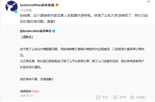 | 4月18日,針對部分網(wǎng)友反映瑞幸餓了么門店存在bug一事,@luckincoffee瑞幸咖啡 發(fā)布道歉信:由于餓了么后臺價格配置問題,導(dǎo)致瑞幸椰云套餐價格短時內(nèi)出現(xiàn)錯誤,門店受到大量異常訂單擠壓,F(xiàn)已緊急取消了餓了么平臺異常訂單,餓了么門店暫時閉店。瑞幸將考慮做用戶補償并另行通知。 |
