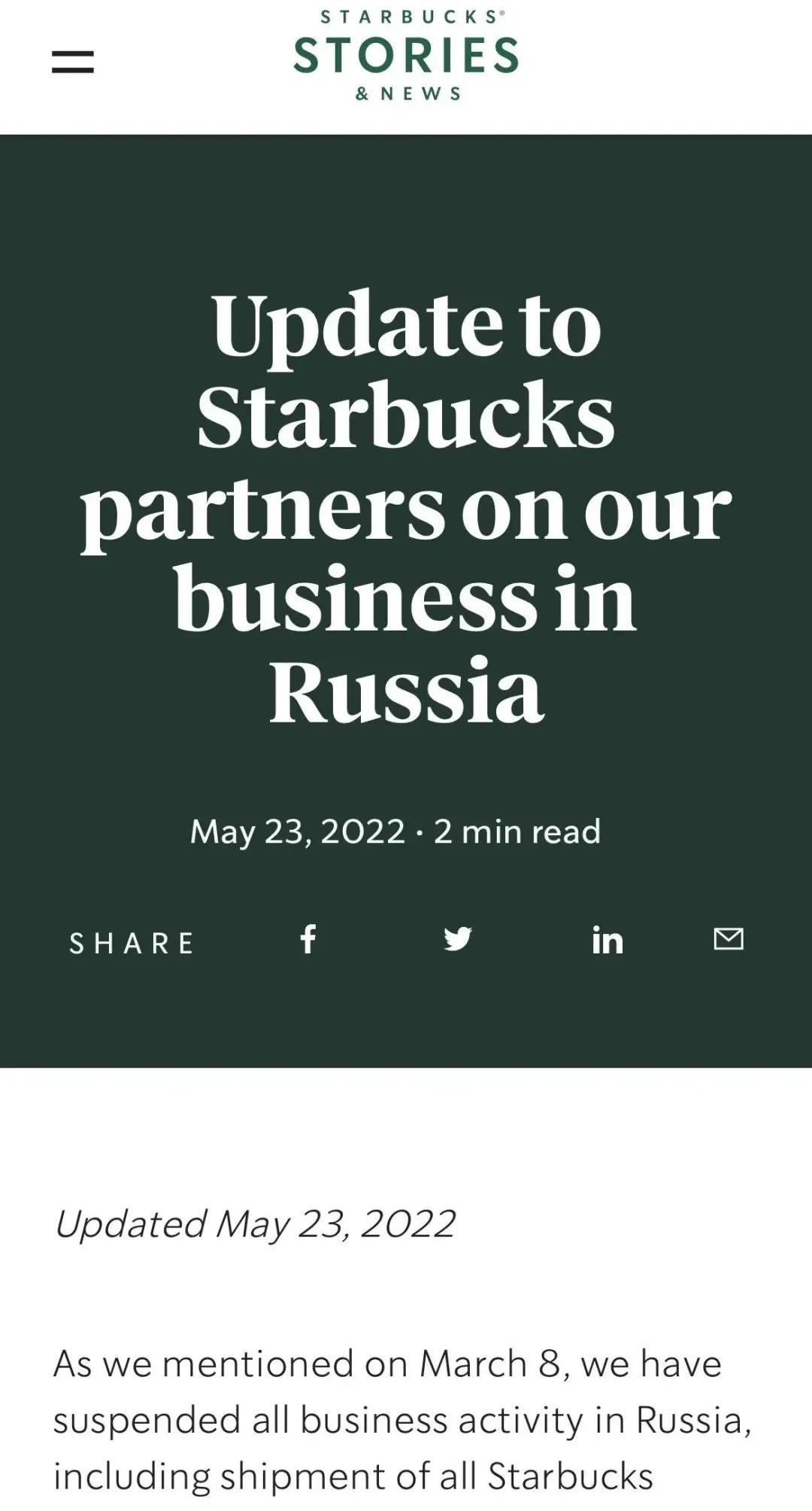 自俄烏沖突爆發(fā)之后,眾多國際品牌宣布暫停俄羅斯業(yè)務(wù),并有進(jìn)一步退出動作。這一次是星巴克。 據(jù)美國ABC新聞網(wǎng)5月23日報道,美國星巴克公司宣布將退出俄羅斯市場。星巴克當(dāng)天在給員工們的備忘錄中表示,決定關(guān)閉其在俄羅斯的130家門店,其品牌在俄羅斯市場上也將不再保留。 不過,星巴克表示,將向其近2000名俄羅斯員工支付6個月的工資,并幫助他們過渡到新工作崗位。據(jù)悉,自俄烏沖突爆發(fā)之后,星巴克已于3月8日起,暫停了在俄羅斯的所有門店業(yè)務(wù)。 資料顯示,星巴克于2007年進(jìn)入俄羅斯市場,130家門店全部由特許合作伙伴全資擁有并經(jīng)營。據(jù)媒體報道,俄羅斯業(yè)務(wù)僅占星巴克年收入不到1%的比例。 |