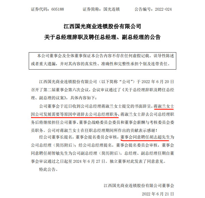 6月20日,江西國光商業(yè)連鎖股份有限公司發(fā)布關(guān)于總經(jīng)理辭職及聘任總經(jīng)理、副總經(jīng)理的公告稱,總經(jīng)理蔣淑蘭因公司發(fā)展需要等原因申請辭去公司總經(jīng)理職務(wù),辭去公司總經(jīng)理職務(wù)后將繼續(xù)擔(dān)任公司董事、董事會戰(zhàn)略委員會委員和董事會薪酬與考核委員會委員職務(wù)。 同時,聘任胡志超為公司總經(jīng)理,胡智敏為公司副總經(jīng)理?偨(jīng)理、副總經(jīng)理任期自董事會審議通過之日起至2024年6月27日。 值得注意的是,國光連鎖今年第一季度財報顯示,公司實現(xiàn)營業(yè)總收入6.16億元,同比增長3.12%;歸母凈利潤1578.38萬元,同比下降47.11%;扣非凈利潤1341.64萬元,同比下降34.78%。 |