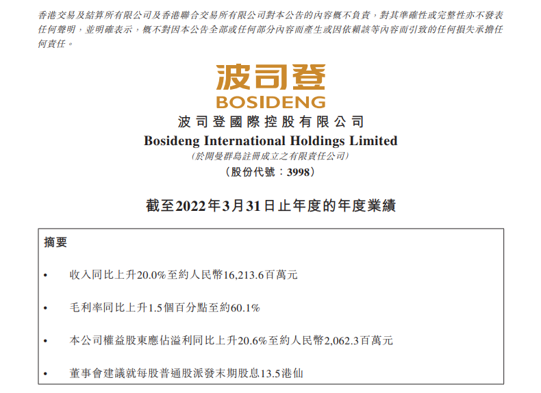 6月23日,波司登公布截至2022年3月31日止年度的年度業(yè)績。 根據(jù)公告,2021/22財(cái)年,波司登實(shí)現(xiàn)收入約人民幣162.14億元(單位下同),同比增加19.95%,權(quán)益股東應(yīng)占溢利約20.62億元,同比增加20.63%。 波司登在公告中表示,品牌羽絨服業(yè)務(wù)、貼牌加工管理業(yè)務(wù)、女裝業(yè)務(wù)及多元化服裝業(yè)務(wù)為集團(tuán)的主營業(yè)務(wù)單元。 品牌羽絨服業(yè)務(wù)仍為波司登集團(tuán)的最大收入來源,取得收入約為人民幣132.23億元,占該集團(tuán)總收入的81.6%,同比上升21.4%;貼牌加工管理業(yè)務(wù)取得收入人民幣19.01億元,占該集團(tuán)總收入的11.7%,同比上升23.8%;女裝業(yè)務(wù)取得收入人民幣9.04億元,占該集團(tuán)總收入的5.6%;多元化服裝業(yè)務(wù)取得收入人民幣1.86億元,占該集團(tuán)總收入的 1.1%,同比上升28.3%。 其中波司登品牌收入同比上升16.3%至116.18億元;雪中飛品牌收入約為9.74億元,同比上升76.6%;冰潔品牌收入約為2.35億元,同比上升60.3%。 |