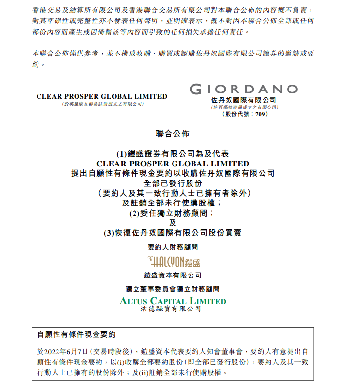 6月23日,佐丹奴發(fā)布公告,香港鄭家純家族旗下公司周大福控股透過鎧盛資本提出收購要約,其中包含注銷未行使購股權(quán)的要求。具體要約提出人為周大福全資子公司 Clear Prosper。 周大福將以每股1.88港元的價(jià)格進(jìn)行收購,較佐丹奴停牌前的每股1.59港元溢價(jià)約18.2%。此次全購要約最高涉及金額達(dá)到25.6億港元(約合21.82億元人民幣)。 佐丹奴成立于1981年,除同名主品牌外,佐丹奴旗下還有 BSX、Junior 和 Giord Ladies 等子品牌。1991 年佐丹奴正式在港交所上市,次年進(jìn)入中國內(nèi)地市場。 據(jù)了解,中國仍是全球佐丹奴最大的市場,但可投放市場295%至7.01億,香港地區(qū)則下降53.1%。2021 年12月31日12月31日,佐丹奴內(nèi)范圍內(nèi)共有2185家,較2020年190年減少家,員工總數(shù)減少1500人。 周大福(HK01929,股價(jià)13.74港元,市值1374億港元)是國內(nèi)市占率排名第一的黃金珠寶零售商。據(jù)2022財(cái)年年報(bào)顯示,營業(yè)額逼近千億港元(989.38億港元),同比大增41%;公司股東應(yīng)占溢利達(dá)到67.12億港元,同比增長11.4%。截至2022年3月31日,周大福零售網(wǎng)絡(luò)擴(kuò)大至5902個(gè)零售點(diǎn),于本財(cái)年凈增加1311個(gè)零售點(diǎn)。 但是,周大福同期近日也了2022年4月1日至5月31日的相關(guān)數(shù)據(jù),但這兩月業(yè)績并不理想。期間,整體零售額同比下降13%,中國內(nèi)地同比下降12.8%,中國香港、中國澳門及其他市場同比下降14.2%。此外,中國內(nèi)地、中國香港及中國澳門的同店銷售額、同店銷量也均呈下降趨勢(shì)。 |