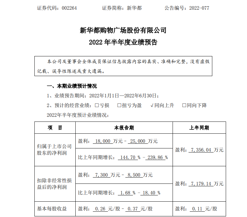 新華都上半年凈利潤(rùn)增長(zhǎng)144.70%-239.86% 7月12日,新華都(002264)購(gòu)物廣場(chǎng)股份有限公司發(fā)布2022年半年度業(yè)績(jī)預(yù)告,歸屬于上市公司股東的凈利潤(rùn)為1.8億元-2.5億元,去年同期為盈利7356萬(wàn)元,凈利潤(rùn)同比增長(zhǎng)144.70%-239.86%。 公告表示,預(yù)計(jì)歸屬于上市公司股東的凈利潤(rùn)同比增長(zhǎng),主要原因: 一是報(bào)告期內(nèi)公司完成零售業(yè)務(wù)板塊 11 家全資子公司 100%股權(quán)轉(zhuǎn)讓事宜,產(chǎn)生投資收益 1.25-1.45 億元,該收益屬于非經(jīng)常性損益。 二是公司主業(yè)互聯(lián)網(wǎng)營(yíng)銷業(yè)務(wù)實(shí)現(xiàn)歸母凈利潤(rùn)同比增長(zhǎng):2022 年上半年公司 GMV 達(dá) 33.93 億元,覆蓋了酒類、水飲、母嬰、家居以及日化等品類,覆蓋了天貓、京東以及其他各平臺(tái);公司自有商號(hào)“酒連酒”上半年 GMV 同比增長(zhǎng) 145%。 報(bào)告期內(nèi),公司與瀘州老窖、汾酒、伊利、云南白藥、郎酒等存量合作品牌延續(xù)了合作關(guān)系,新簽約了人民小酒、習(xí)酒、五糧醇、華妍、養(yǎng)元素芽膳等新品牌,新開(kāi)拓了古井貢天貓超市、張?jiān)L熵埑、云南白藥醫(yī)療器械、郎聚量京東和天貓專賣店等存量品牌新渠道新品類,整體豐富了公司的品牌矩陣,進(jìn)一步夯實(shí)了公司在酒類優(yōu)勢(shì)賽道的市場(chǎng)地位,初步拓展了大健康賽道。 “618”為上半年重要的電商大促節(jié)點(diǎn),公司積極迎戰(zhàn),所獲成績(jī)奠定了 2022年業(yè)績(jī)基礎(chǔ)。公司運(yùn)營(yíng)的多品牌成交金額大幅增長(zhǎng),展現(xiàn)了公司效果營(yíng)銷及產(chǎn)品運(yùn)營(yíng)實(shí)力。 |