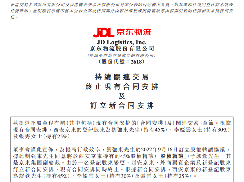 9月16日電,京東物流公告稱,為提高行政效率,劉強(qiáng)東先生于2022年9月16日訂立股權(quán)轉(zhuǎn)讓協(xié)議,據(jù)此劉強(qiáng)東先生同意將于西安京東持有的45%股權(quán)轉(zhuǎn)讓予繆欽先生,其是京東集團(tuán)副總裁。 由于一面登記股東變更,鮮京東、外商獨資企業(yè)及新登記股東訂立合同安排,現(xiàn)在有合同安排同時終止。根據(jù)新合同安排,根據(jù)新合同安排,西安京東的新登記股東為繆欽(持有45%)、李婭云女士(持有30%)及張雱女士(持有25%)。 至于劉強(qiáng)東轉(zhuǎn)讓的原因,公告給出了相似的解釋。一是法律法規(guī)的問題,二是劉強(qiáng)東先生為非執(zhí)行董事,不參與兩家的日常營運(yùn),簽署相關(guān)文件存在實際困難。為提高行政效率,兩公司的各項行政事務(wù)或備案由繆欽(京東集團(tuán)副總裁)管理將更為高效。 京東物流的業(yè)務(wù)中,還包括在中國提供國內(nèi)信件快遞業(yè)務(wù)。根據(jù)適用中國法律法規(guī),外國投資者禁止開展國內(nèi)信件快遞業(yè)務(wù)。因此,京東物流采納現(xiàn)有合同安排,由西安京東及其子公司持有開展有關(guān)服務(wù)及經(jīng)營上述業(yè)務(wù)所需的相關(guān)執(zhí)照,然后通過京東物流旗下全資子公司對西安京東等行使控制權(quán),并將后者財務(wù)業(yè)績并入業(yè)績。 |