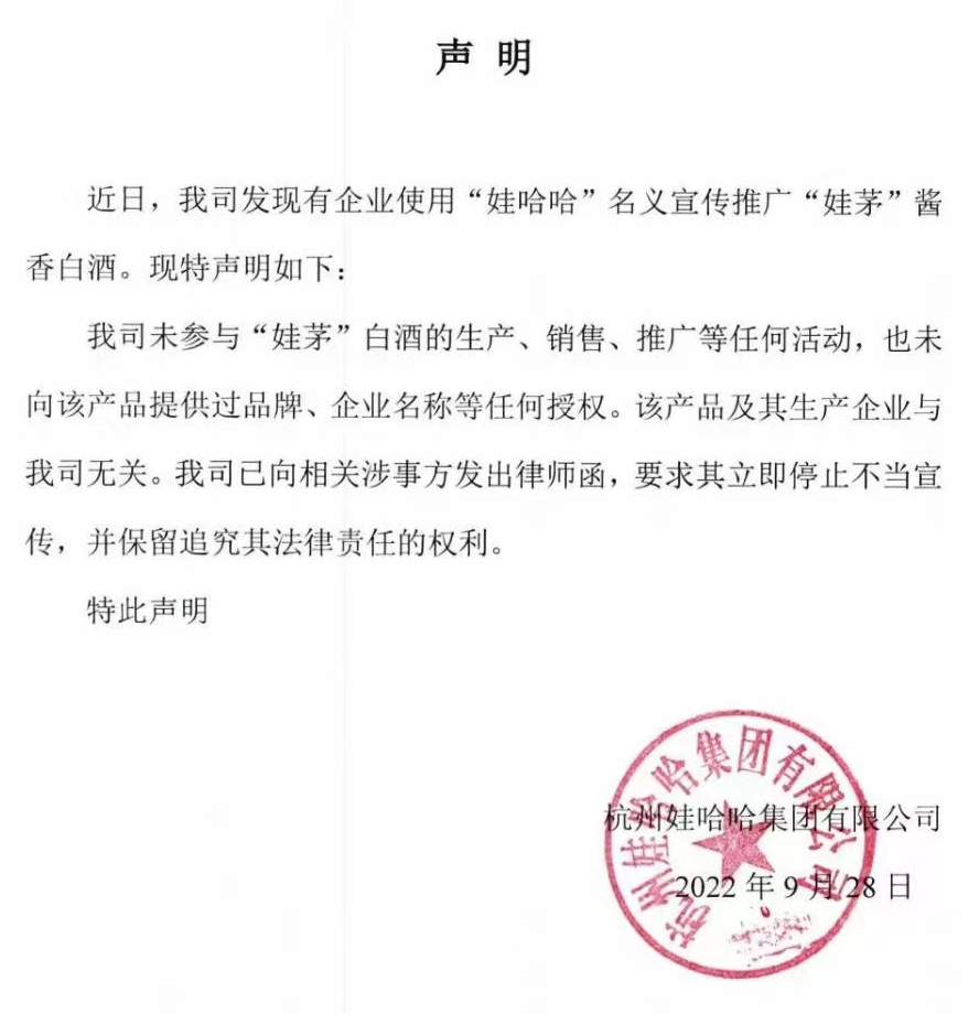 | 9月28日,娃哈哈官網(wǎng)掛出聲明,表示公司發(fā)現(xiàn)有企業(yè)使用“娃哈哈”名義宣傳推廣“娃茅”醬香白酒,但娃哈哈未參與“娃茅”白酒的生產(chǎn)、銷(xiāo)售、推廣等任何活動(dòng),也未向該產(chǎn)品提供過(guò)品牌、企業(yè)名稱(chēng)等任何授權(quán)。該產(chǎn)品及其生產(chǎn)企業(yè)與娃哈哈無(wú)關(guān)。(公司發(fā)布) |