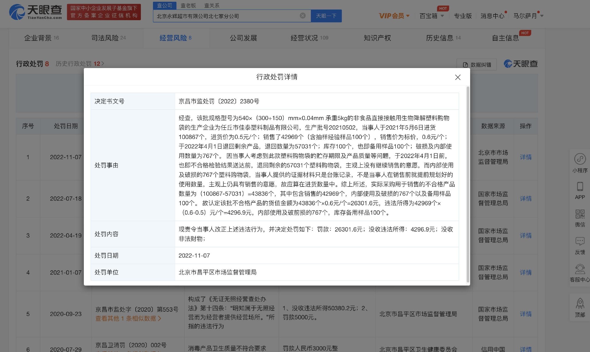 天眼查App顯示,近日,北京有限公司北七家分公司被北京市昌平區(qū)市場監(jiān)督管理局罰款2.6萬余元,并沒收違法所得4000余元。 處罰事由顯示,當事人購進10萬余個非食品直接接觸用生物降解購物袋,進貨價為0.5元/個,銷售價為標價0.6元/個,共銷售約4.3萬個,后該購物袋經(jīng)檢驗,結(jié)果為不合格。 當事人考慮到購物袋的貯存期限及產(chǎn)品質(zhì)量等問題,在不合格檢驗結(jié)果送達前,已退回5.7萬余個。 |