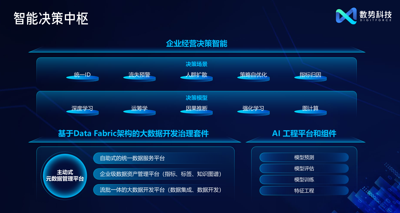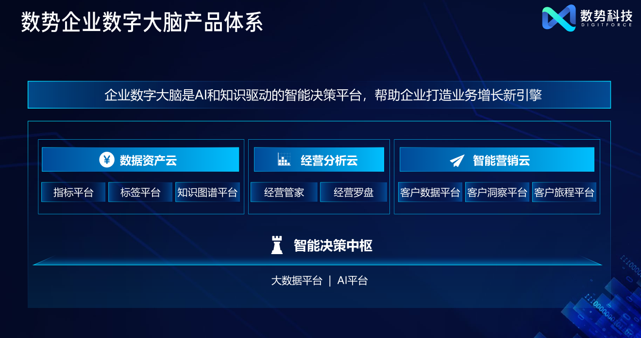 11 月 17 日下午,2022數(shù)勢科技產(chǎn)品發(fā)布會線上直播圓滿閉幕。發(fā)布會以“Digitforce 數(shù)字原力 勢在必行”為主題,面向企業(yè)核心經(jīng)營場景,發(fā)布一系列基于企業(yè)數(shù)字大腦理念的智能決策產(chǎn)品,幫助企業(yè)最大化地發(fā)揮數(shù)據(jù)價值。會議當中,數(shù)勢科技還邀請了眾多零售、金融企業(yè)的高管、數(shù)字化負責人和行業(yè)專家,分享數(shù)字化轉(zhuǎn)型的最佳實踐,共同探索企業(yè)數(shù)字化升級的最佳路徑。 (發(fā)布會活動主舞臺) 數(shù)字化轉(zhuǎn)型 = 業(yè)務規(guī)劃+技術支持+組織變革 數(shù)字經(jīng)濟浪潮下,數(shù)字化轉(zhuǎn)型成為企業(yè)增長的必經(jīng)之路,但何為可以創(chuàng)造價值的業(yè)務轉(zhuǎn)型?怎樣才能更好的實現(xiàn)企業(yè)韌性增長?貝恩公司大中華區(qū)總裁、全球董事會成員韓微文先生在開場演講中提出“數(shù)字化轉(zhuǎn)型 =業(yè)務規(guī)劃+技術支持+組織變革”。數(shù)字化轉(zhuǎn)型,要以能為消費者和客戶帶來價值為根本出發(fā)點,企業(yè)既要有過硬的技術能力,也要對行業(yè)趨勢有精準洞察,以此形成基于行業(yè)Know-how和技術Know-how的扎實方法論,再配合企業(yè)內(nèi)部組織工作方式的提升,才能行之有效。 (貝恩大中華區(qū)總裁、全球董事會成員 韓微文) 數(shù)勢科技作為國內(nèi)領先的數(shù)據(jù)智能平臺與技術服務提供商,與韓總的見解不謀而合。數(shù)勢正是依托于核心團隊豐富的金融和消費領域業(yè)務know-how及技術know-how,研發(fā)智能決策產(chǎn)品,希望能助力更多企業(yè)實現(xiàn)數(shù)字化升級,正是懷著這樣的初心,數(shù)勢科技于2020年正式成立。同時,全球受疫情影響,越來越多的企業(yè)主動擁抱數(shù)字化,對數(shù)字科技公司而言是挑戰(zhàn)也是機遇。數(shù)勢科技創(chuàng)始人兼CEO黎科峰博士率領團隊,將過去多年積累下來的數(shù)字化轉(zhuǎn)型經(jīng)驗和最佳實踐,與傳統(tǒng)的實體經(jīng)濟相結(jié)合,打造出新時代的企業(yè)服務產(chǎn)品,希望幫助企業(yè)在數(shù)字化轉(zhuǎn)型的浪潮下,增強競爭力,實現(xiàn)更長遠的健康發(fā)展。 智能決策:數(shù)字化時代企業(yè)提升經(jīng)營效率的核心主題 黎科峰博士在演講中指出,“技術是真正能長周期地去影響一個企業(yè),影響一個行業(yè)、甚至一個社會和國家的核心關鍵因素。”計算技術發(fā)展經(jīng)歷了從最初的電子化時代、PC時代,到如今云計算和大數(shù)據(jù)時代,我們正在邁向基于數(shù)據(jù)的智能時代。而與之對應的企業(yè)經(jīng)營,也經(jīng)歷了從Excel時代到信息化時代,再到數(shù)字化時代的轉(zhuǎn)變。企業(yè)也面臨著諸多從信息化到數(shù)字化轉(zhuǎn)變中的差異性問題,如從單一渠道經(jīng)營向全渠道經(jīng)營的轉(zhuǎn)變,以產(chǎn)品為中心向以用戶為中心的轉(zhuǎn)變。同時企業(yè)經(jīng)營也從依賴于管理者和專家的經(jīng)驗和直覺,轉(zhuǎn)變?yōu)榛诖髷?shù)據(jù)和智能化的經(jīng)營決策。 (數(shù)勢科技創(chuàng)始人兼CEO 黎科峰) 面對這些差異性問題,企業(yè)需要從多個維度出發(fā),包括組織、文化、人才等等。但從技術的視角來看,企業(yè)也需要圍繞數(shù)字化構(gòu)建新的技術架構(gòu)。這個數(shù)字化架構(gòu)包括底層的基礎設施,像私有云、公有云、混合云、IoT設備等等,它是企業(yè)所有系統(tǒng)運行的基座。在基礎設施之上分為數(shù)字化和信息化兩個部分,數(shù)字化會利用信息化產(chǎn)生的海量數(shù)據(jù),對數(shù)據(jù)進行加工處理,并灌注智能化的能力,再通過智能決策產(chǎn)品,把決策作用到業(yè)務系統(tǒng)中,并進行智能重塑。所以數(shù)字化部分和信息化部分是相輔相成的,它們形成了一個正向的循環(huán),從而產(chǎn)生合力,作用到企業(yè)的各類業(yè)務場景中。 黎博士認為當下企業(yè)的經(jīng)營環(huán)境和之前的環(huán)境已大不相同,是一個更多維度更復雜的方程式,光靠過往的經(jīng)驗和單純靠人腦已經(jīng)很難去解這樣一個高階的方程,F(xiàn)在企業(yè)經(jīng)營中的決策需要更多地依賴大數(shù)據(jù),實現(xiàn)智能決策,即通過邏輯推理、因果分析和博弈論等知識框架,利用數(shù)據(jù)和模型在業(yè)務場景下進行策略構(gòu)建和提供決策支持。這種智能的決策可以應用在企業(yè)經(jīng)營的方方面面,無論是在經(jīng)營分析、客戶運營、供應鏈管理等等,幫助人們做出更好的決策。 然而,智能決策并不僅僅是一個技術概念,它是大數(shù)據(jù)加人工智能加業(yè)務know-how的有機組合。智能決策是為業(yè)務場景提供決策,是對業(yè)務產(chǎn)生直接作用的,所以必須要有非常深厚的業(yè)務know-how。只有懂業(yè)務,才能清楚如何在業(yè)務中使用數(shù)據(jù)和AI,如何讓數(shù)據(jù)和AI在業(yè)務中發(fā)揮價值,而不是拿著錘子到處去找釘子。因此我們可以看出,過去企業(yè)所建設的信息化系統(tǒng),就像企業(yè)的心血管系統(tǒng)一樣,而智能決策則是企業(yè)在數(shù)字化時代的大腦,可以最大化地幫助企業(yè)發(fā)揮數(shù)據(jù)價值。 企業(yè)數(shù)字化大腦產(chǎn)品體系:數(shù)據(jù)資產(chǎn)云+經(jīng)營分析云+