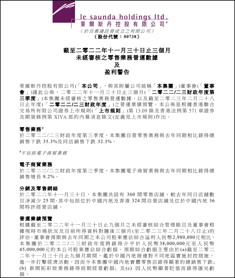 12月12日晚間,萊爾斯丹發(fā)布公告稱,于2022/23財政年度第三季度,集團自營零售業(yè)務(wù)與去年同期相比錄得總銷售下跌35.3%及同店銷售下跌32.3%。于2022/23財政年度第三季度,集團電子商貿(mào)業(yè)務(wù)與去年同期相比錄得總銷售增長8.2%。 于2022年11月30日,集團共設(shè)有360間零售店鋪,較去年同日店鋪數(shù)目凈減少25間。其中包括位于中國內(nèi)地及香港324間自營店鋪及位于中國內(nèi)地36間特許經(jīng)營店鋪。 董事會預(yù)期與去年同期公司股東應(yīng)占綜合溢利人民幣298萬元相比,集團于2022/23財政年度將錄得介乎于人民幣3800萬元至人民幣4500萬元的公司股東應(yīng)占綜合虧損。 預(yù)期綜合虧損主要由于截至2022年11月30日止9個月期間,鑒于中國內(nèi)地接連對不同地區(qū)實施封控措施,進一步打擊經(jīng)濟活動,因而令集團中國內(nèi)地實體零售店錄得顯著的總銷售下跌;新開拓彩妝業(yè)務(wù)錄得前期經(jīng)營虧損;及因人民幣顯著貶值而錄得匯兌虧損。 |