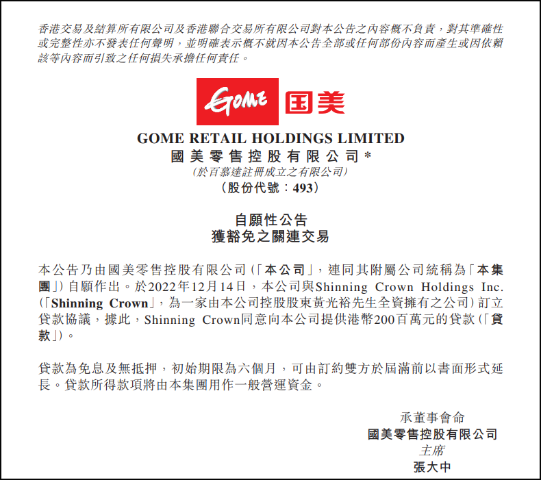 12月14日消息,國(guó)美零售發(fā)布公告稱,公司與Shinning Crown Holdings Inc.(“Shinning Crown”,為一家由公司控股股東黃光裕全資擁有之公司)訂立貸款協(xié)議,據(jù)此,Shinning Crown同意向公司提供港幣2億元的貸款。貸款為免息及無(wú)抵押,初始期限為六個(gè)月,可由訂約雙方于屆滿前以書(shū)面形式延長(zhǎng)。貸款所得款項(xiàng)將由集團(tuán)用作一般營(yíng)運(yùn)資金。 值得注意的是,12月8日提供1.5億港元無(wú)息貸款,本月累計(jì)3.5億港元。貸款為免息及無(wú)抵押,初始期限為6個(gè)月,可由訂約雙方于屆滿前以書(shū)面形式延長(zhǎng)。貸款所得款項(xiàng)將由集團(tuán)用作一般營(yíng)運(yùn)資金。 |