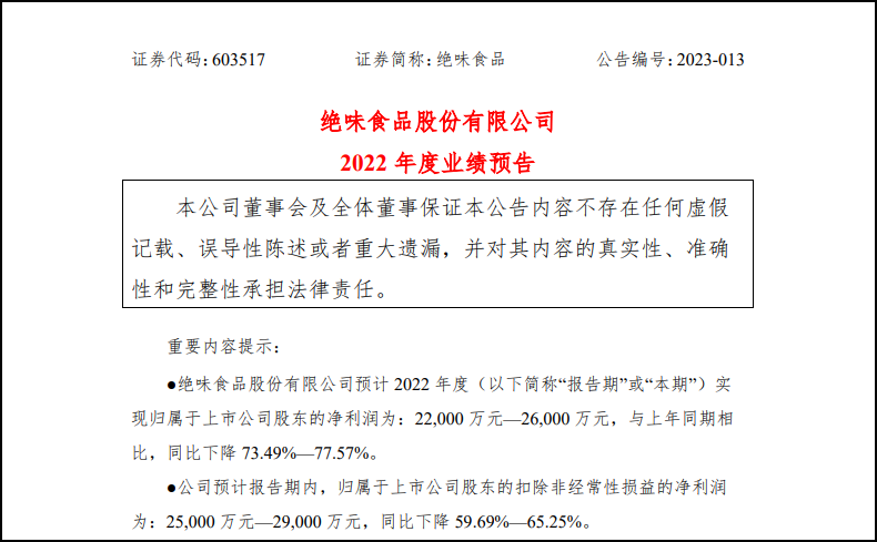 1月29日,絕味食品發(fā)布2022年度業(yè)績(jī)預(yù)告,公司預(yù)計(jì)2022年度實(shí)現(xiàn)歸屬于上市公司股東的凈利潤(rùn)為2.2億元-2.6億元,與上年同期相比,同比下降73.49%—77.57%; 預(yù)計(jì)2022年度實(shí)現(xiàn)營(yíng)業(yè)收入66億元-68億元,較上年同期營(yíng)業(yè)收入同比上升0.78%—3.83%?鄢墙(jīng)常性損益后的凈利潤(rùn)為2.5億元至2.9億元,同比下降59.69%至65.25%。 |