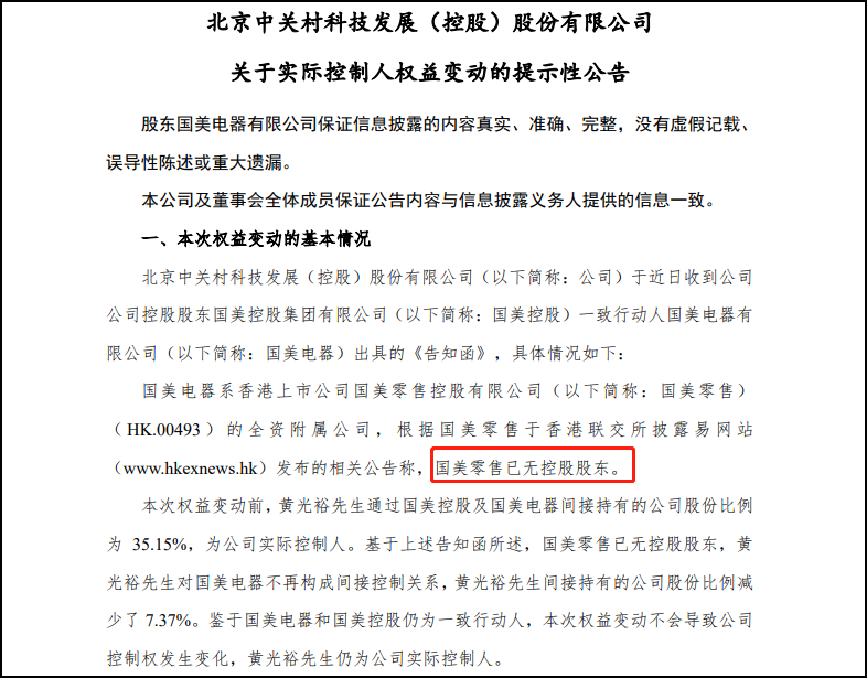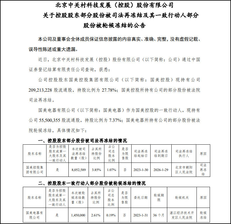 2月3日,國(guó)美A股重要資本平臺(tái)中關(guān)村連發(fā)三條公告,涉及事項(xiàng)包括國(guó)美控股質(zhì)押的中關(guān)村股票爆倉、國(guó)美控股及國(guó)美電器持有股份新增輪候凍結(jié)、黃光裕不再是國(guó)美零售(00493.HK)的控股股東等。 根據(jù)中關(guān)村公告,公司于近日收到控股股東國(guó)美控股出具的《告知函》,獲悉國(guó)美控股在中信證券客戶信用交易擔(dān)保證券賬戶所持有的部分公司股份于2023年2月1日至2023年2月3日期間被中信證券強(qiáng)制平倉,被動(dòng)減持?jǐn)?shù)量為1562.1萬股,占公司總股本的比例為2.07%,減持獲得資金全部用于歸還國(guó)美控股在中信證券的融資。 該筆強(qiáng)制平倉涉及金額1.03億元,而減持的這三個(gè)交易日中關(guān)村成交額不到4億元,也就是說四分之一的賣盤來自中信證券。2月1日到3日,中關(guān)村股價(jià)下跌約2.4%。 截至2月3日,國(guó)美控股和國(guó)美電器已經(jīng)累計(jì)被凍結(jié)近1.8億股,占到其持股數(shù)的近六成,累計(jì)被輪候凍結(jié)4.45億股,為其持股數(shù)的1.78倍。 中關(guān)村稱,上述股份新增被司法再凍結(jié)、輪候凍結(jié)的主要原因和訴訟涉及債務(wù)金額公司暫時(shí)無法獲悉,公司將持續(xù)關(guān)注司法凍結(jié)和輪候凍結(jié)事項(xiàng)的后續(xù)進(jìn)展情況。 此外,中關(guān)村還公告了一則值得關(guān)注的消息:近日收到控股股東國(guó)美控股一致行動(dòng)人國(guó)美電器出具的《告知函》稱,國(guó)美電器系國(guó)美零售全資附屬公司,根據(jù)國(guó)美零售于香港聯(lián)交所披露易網(wǎng)站發(fā)布的相關(guān)公告稱,國(guó)美零售已無控股股東。但國(guó)美零售無控股股東不會(huì)導(dǎo)致中關(guān)村實(shí)控人發(fā)生變化。 本次權(quán)益變動(dòng)前,黃光裕通過國(guó)美控股及國(guó)美電器間接持有的公司股份比例為35.15%,為公司實(shí)際控制人;谏鲜龈嬷,國(guó)美零售已無控股股東,黃光裕對(duì)國(guó)美電器不再構(gòu)成間接控制關(guān)系,黃光裕間接持有的公司股份比例減少了7.37%。但鑒于國(guó)美電器和國(guó)美控股仍為一致行動(dòng)人,本次權(quán)益變動(dòng)不會(huì)導(dǎo)致公司控制權(quán)發(fā)生變化,黃光裕仍為公司實(shí)際控制人。 股權(quán)示意圖顯示,本次權(quán)益變動(dòng)前,黃光裕對(duì)國(guó)美電器持股57.13%;變動(dòng)后,黃光裕對(duì)國(guó)美電器持股10.79%。根據(jù)港交所的最新披露,黃氏夫婦目前持股比例為30.85%。 根據(jù)港交所披露易數(shù)據(jù)顯示,從2021年9月27日開始,黃光裕、杜鵑夫婦持續(xù)減持國(guó)美零售股票,截至到2022年12月7日,持股比例已經(jīng)大幅下降一半以上,從61.5%降至29.96%,套現(xiàn)金額在10億港元以上。此后,黃氏夫婦繼續(xù)加碼拋售,截至2023年1月11日,其持股比例已經(jīng)下降到10.79%,也就是說一個(gè)月時(shí)間又砍掉手中一半以上持股。 此期間,國(guó)美零售的股價(jià)則是持續(xù)下跌,從0.77港元/股附近跌至最低的0.106港元/股,跌幅超過85%。截至2023年2月3日收盤,國(guó)美零售市值僅剩68億港元。 最后,不過,陷入困難重重的國(guó)美零售,近日股價(jià)有所反彈,市場(chǎng)認(rèn)為這與黃光裕的妹妹黃秀虹的最新戰(zhàn)略反思有關(guān)。 近日,國(guó)美電器董事長(zhǎng)、國(guó)美創(chuàng)始人黃光裕的妹妹黃秀虹在一場(chǎng)內(nèi)部戰(zhàn)略實(shí)施策略研討會(huì)上回顧了過往的戰(zhàn)略打法。 黃秀虹表示,2022全球經(jīng)濟(jì)下行、疫情的長(zhǎng)達(dá)三年的大疫、銀行斷貸、供應(yīng)商欠款、員工欠薪等各種危機(jī)讓國(guó)美險(xiǎn)些倒下,而“生存”成了發(fā)展的核心要?jiǎng)?wù)。黃秀虹提到:不管是線上業(yè)務(wù)的發(fā)展還是線下門店的革新,我們好像總是打不到關(guān)鍵點(diǎn)上,總是在試錯(cuò),是戰(zhàn)略規(guī)劃的問題還是戰(zhàn)術(shù)打法的問題?這些都值得我們不斷反思! 去年10月,國(guó)美零售發(fā)布盈利警告,預(yù)計(jì)2022年歸母凈利潤(rùn)虧損將比2021年擴(kuò)大35%-65%。而此前的2017年至2021年,國(guó)美零售已經(jīng)處于持續(xù)虧損狀態(tài),規(guī)模凈利潤(rùn)分別為-4.5億、-48.87億、-25.90億、-69.94億、-44.02億元,五年累計(jì)虧損近200億元。 黃秀虹的反思是否能扭轉(zhuǎn)國(guó)美呢?我們拭目以待。 |
