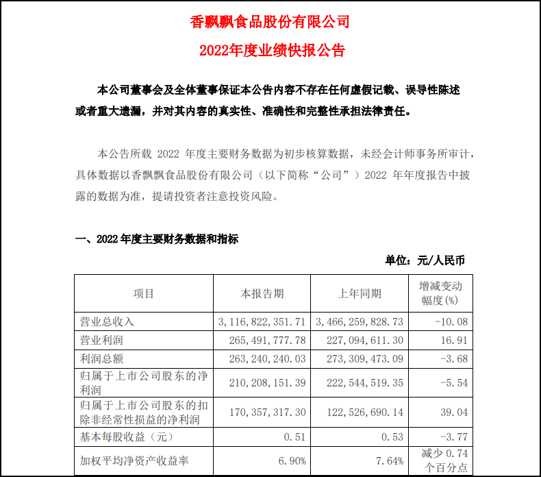 2月6日,香飄飄發(fā)布2022年業(yè)績快報顯示,公司實現(xiàn)營業(yè)總收入31.17億元,同比下降10.08%;歸屬于上市公司股東的凈利潤2.1億元,同比下降5.54%。 對于營收下滑,香飄飄表示主要原因是公司沖泡產(chǎn)品銷量雖同比下降,但產(chǎn)品毛利企穩(wěn)回升;此外,公司積極改善企業(yè)經(jīng)營管理效率,提升經(jīng)營質(zhì)量。 報告期內(nèi),香飄飄歸屬于上市公司股東的扣非凈利潤1.7億元,比上年同期增長39.04%,香飄飄稱,公司沖泡產(chǎn)品的毛利率2022年下半年開始企穩(wěn),同時費用端積極控制,盈利能力得到改善。 |