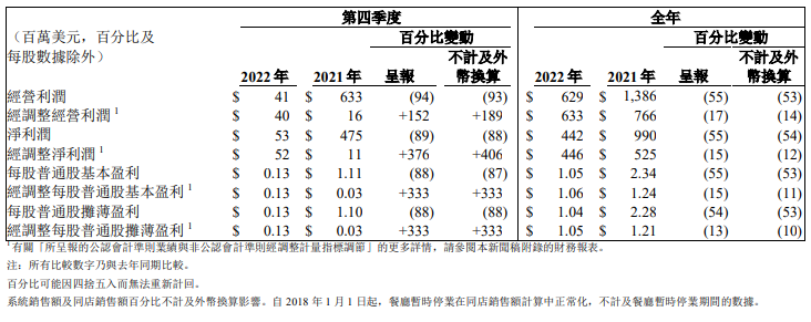 2月8日,百勝中國發(fā)布截至2022年12月31日的2022年度第四季度及全年未經(jīng)審核的財務業(yè)績。 財報顯示,2022年第四季度百勝中國總收入為20.9億美元,較2021年同期的22.9億美元下降9%;不計及外幣換算的影響,四季度公司系統(tǒng)銷售額和同店銷售額均較2021年同期均下降4%;經(jīng)營利潤為0.41億美元,較2021年同期的6.33億美元下降94%。 整個2022年,百勝中國全年總收入為95.7億美元,較2021年同期的98.5億美元下降 3%;不計及外幣換算的影響,全年系統(tǒng)銷售額和同店銷售額分別下降5%和7%;全年經(jīng)營利潤為6.29 億美元,較2021年同期的13.9億美元下降 55%;全年凈利潤為4.42億美元,較2021年同期的9.90億美元下降55%。 據(jù)財報披露,百勝中國四季度凈新增門店538家,全年凈新增門店1159家,其中肯德基在2022年第四季度和2022全年分別凈新增419家和926家門店,必勝客在2022年第四季度和2022全年分別凈新增97家和313家門店。截至2022年底,兩大“主力”品牌餐廳數(shù)據(jù)分別達到9094家和2903家,較2021年增長11.34%和12.08%,占百勝中國2022年末門店總數(shù)的70.24%和22.42%。 |