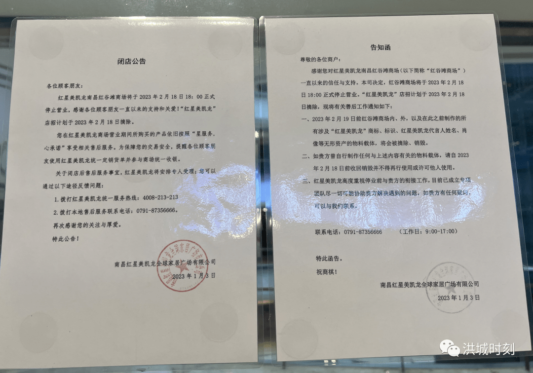 近日,南昌紅谷灘紅星美凱龍發(fā)布閉店公告。從公告信息看,紅星美凱龍南昌紅谷灘商場(chǎng)將于2023年2月18日18:00正式停止?fàn)I業(yè),其中“紅星美凱龍”店招計(jì)劃于2023年2月18日摘除。 2023年2月19日前紅谷灘商場(chǎng)內(nèi)、外,以及在此之前制作的所有涉及“紅星美凱龍”商標(biāo)、標(biāo)識(shí)、紅星美凱龍代言人姓名、肖像等無(wú)形資產(chǎn)的物料載體,將會(huì)被摘除、銷毀。該紅星美凱龍撤店后,南昌僅剩下2家門店(朝陽(yáng)店、象湖店)。 |