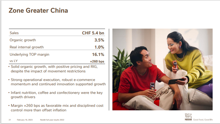 近日,全球最大食品公司雀巢發(fā)布了2022年全年財(cái)報(bào)。財(cái)報(bào)顯示,該集團(tuán)全年財(cái)報(bào)總銷售額增長(zhǎng)8.4%,達(dá)到944億瑞士法郎(2021年:871億瑞士法郎)。有機(jī)增長(zhǎng)率達(dá)到8.3%,實(shí)際內(nèi)部增長(zhǎng)率為0.1%,定價(jià)貢獻(xiàn)率8.2%,反映出顯著成本通脹。 值得注意的是,雀巢大中華大區(qū)2022年度收入為54億瑞郎,或折合人民幣381.6億元(按雀巢年報(bào)中的2022年加權(quán)平均年匯率計(jì)算,100元人民幣兌換14.148瑞士法郎),增長(zhǎng)3.4%。這也是雀巢成立大中華大區(qū)之后,首份單獨(dú)披露中國(guó)市場(chǎng)業(yè)績(jī)的完整年報(bào)。 |
