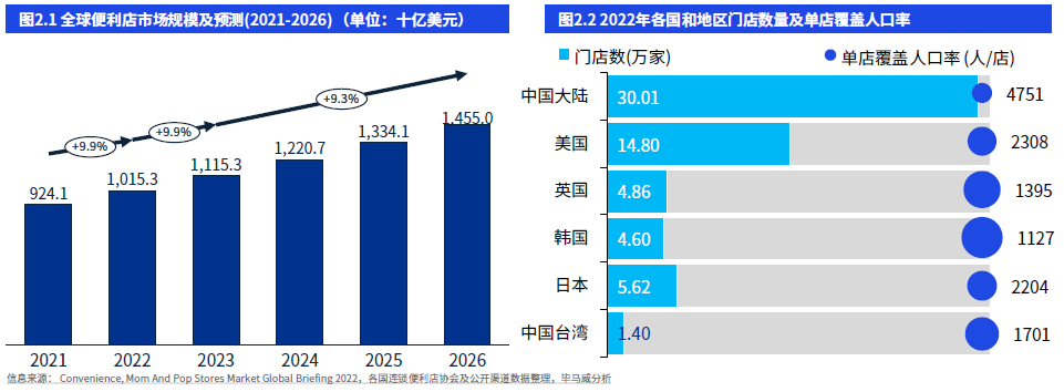 近日,畢馬威&中國(guó)經(jīng)營(yíng)連鎖協(xié)會(huì)發(fā)布了《2023年中國(guó)便利店發(fā)展報(bào)告》。 報(bào)告指出,2022年,在全球范圍內(nèi),便利店市場(chǎng)規(guī)模得到明顯的復(fù)蘇。2022年全球便利店行業(yè)市場(chǎng)規(guī)模為10153億美元,首次突破一萬(wàn)億美元,規(guī)模較2021年上升9.9%,預(yù)計(jì)2023到2026年,全球便利店市場(chǎng)年復(fù)合增長(zhǎng)率達(dá)9.3%。 在滲透率方面,中國(guó)大陸便利店覆蓋人數(shù)為4751人/店,相比2021年(7033人/店),滲透率得到提高,但對(duì)比樣本國(guó)家和地區(qū),中國(guó)大陸便利店市場(chǎng)蘊(yùn)藏著巨大的增長(zhǎng)潛力和廣闊的發(fā)展空間。 在行業(yè)發(fā)展方面,便利店行業(yè)整體發(fā)展向好。2022年便利店銷售額3834億元,增速達(dá)到9.8%,門店規(guī)模達(dá)到30萬(wàn)家,按年增速約19%。值得注意的是,已有超80%便利店已搭建便利店體系,銷售占比及會(huì)員客單價(jià)穩(wěn)步提升。 |