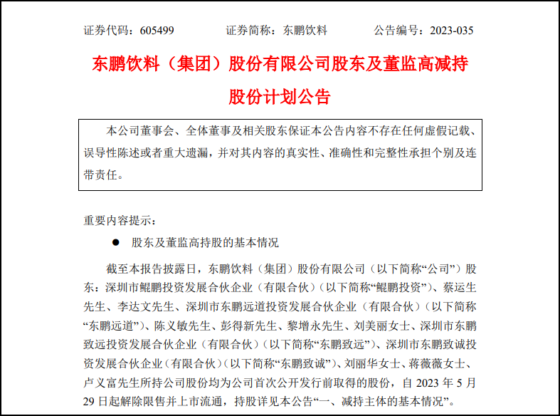 | 5月29日,東鵬飲料發(fā)布公告顯示,股東減持的股份均為IPO前取得,減持理由均為自身資金需求。值得注意的是,這些股份均為當(dāng)日剛剛解禁。若以公告當(dāng)日收盤價(jià)計(jì)算,合計(jì)擬套現(xiàn)金額近60億元。 |