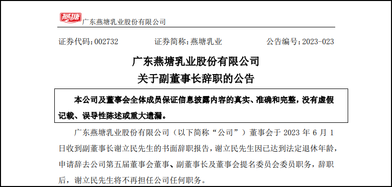 6月1日,廣東燕塘乳業(yè)股份有限公司董事會(huì)收到副董事長(zhǎng)謝立民的書面辭職報(bào)告,因已達(dá)到法定退休年齡,其申請(qǐng)辭去公司第五屆董事會(huì)董事、副董事長(zhǎng)及董事會(huì)提名委員會(huì)委員職務(wù),辭職后謝立民將不再擔(dān)任公司任何職務(wù)。 |