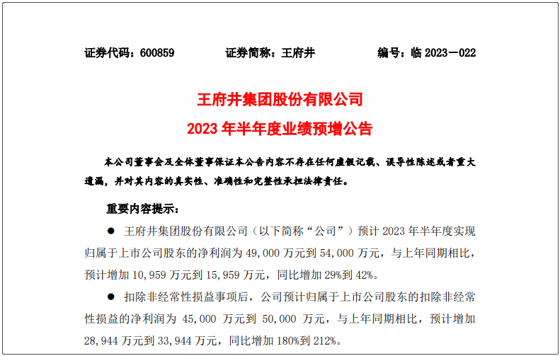 職業(yè)零售網(wǎng)獲悉,7月6日,王府井集團(tuán)股份有限公司發(fā)布2023年半年度業(yè)績預(yù)增公告。 公告顯示,預(yù)計2023年半年度實現(xiàn)歸屬于上市公司股東的凈利潤為4.9億元-5.4億元,與上年同期相比,預(yù)計增加1.09億元到1.59億元,同比增加29%-42%?鄢墙(jīng)常性損益事項后,公司預(yù)計歸屬于上市公司股東的扣除非經(jīng)常性損益的凈利潤為4.5億元到5.億元,與上年同期相比,預(yù)計增加2.89億元到3.39億元,同比增加180%到212%。 公司業(yè)績預(yù)增的主要原因有兩個方面。第一,主營業(yè)務(wù)表現(xiàn)良好。隨著經(jīng)濟(jì)復(fù)蘇向好,多元消費需求持續(xù)釋放,零售市場呈現(xiàn)回升向好態(tài)勢。公司旗下各業(yè)態(tài)、門店緊抓消費復(fù)蘇回暖機(jī)遇,開展多項特色主題營銷活動,呈現(xiàn)出區(qū)域深耕、協(xié)同促進(jìn)的良好局面,營業(yè)收入持續(xù)改善。特別是公司奧萊和購物中心業(yè)態(tài)受新生活方式消費的帶動,呈現(xiàn)出較為明顯的恢復(fù)態(tài)勢,均較上年同期實現(xiàn)較大增幅,拉動公司業(yè)績持續(xù)增長。 第二,非經(jīng)營性損益也對公司業(yè)績產(chǎn)生了影響。報告期內(nèi),公司非經(jīng)常性損益較上年同期大幅減少,主要受上年同期公司收購北京王府井購物中心管理有限責(zé)任公司 12%股權(quán)事項影響所致。同時受特殊因素影響,公司上年同期歸屬于上市公司股東的扣除非經(jīng)常性損益的凈利潤較低。受上述因素共同影響,報告期歸屬于上市公司股東的扣除非經(jīng)常性損益的凈利潤同比增幅較大。 |