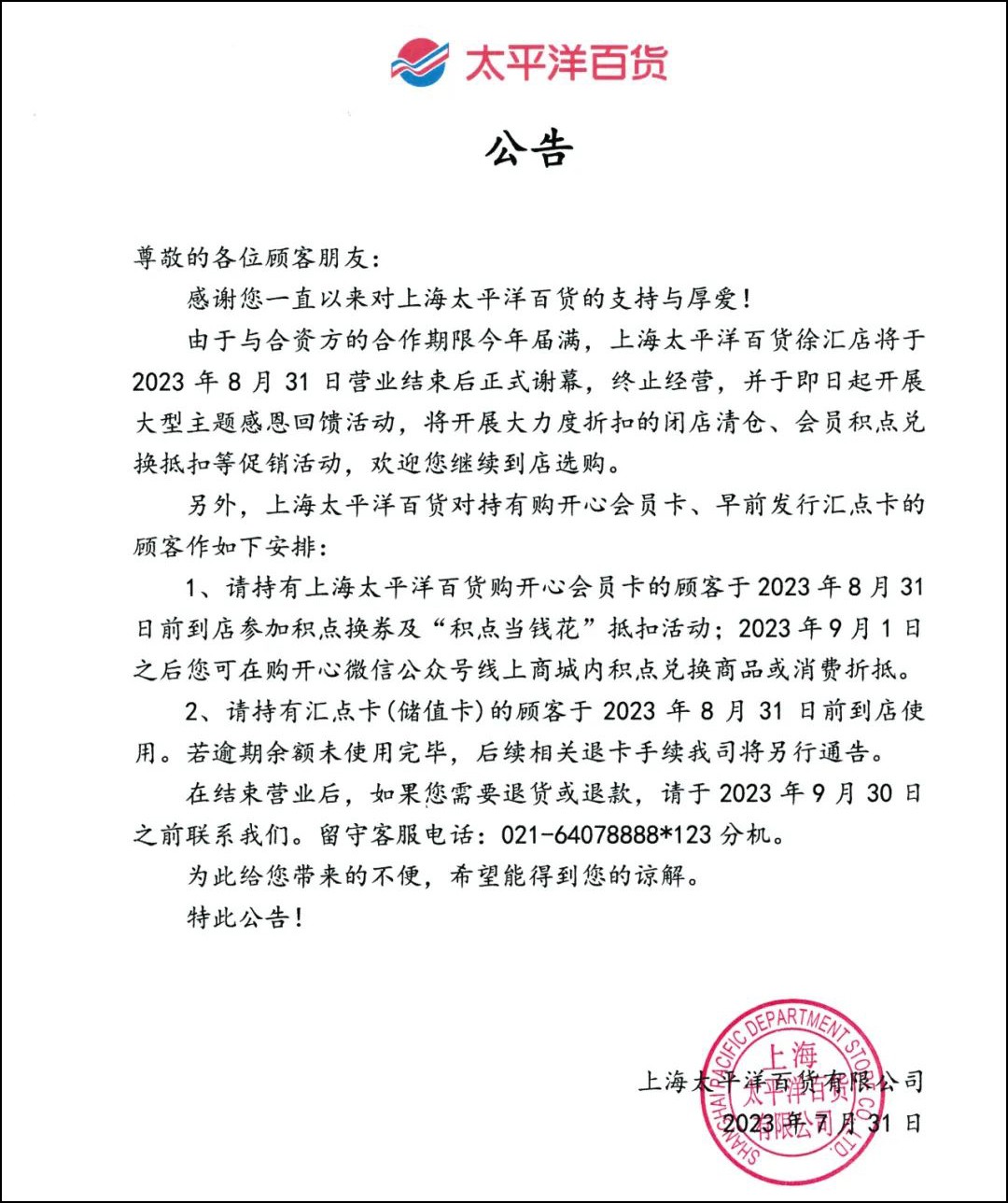 開業(yè)30年,太平洋百貨上海最后一家門店宣布8月底謝幕。 7月31日,上海太平洋百貨有限公司官方微信公眾號(hào)發(fā)布《倒計(jì)時(shí)32天,感恩謝幕》公告。公告中表示,“由于與合資方的合作期限今年屆滿,上海太平洋百貨徐匯店將于2023年8月31日營(yíng)業(yè)結(jié)束后終止經(jīng)營(yíng)! 該公告還寫道,太平洋百貨徐匯店即日起開展大型主題回饋活動(dòng),將開展大力度折扣的閉店清倉(cāng)、會(huì)員積點(diǎn)兌換抵扣等促銷活動(dòng)。 據(jù)了解,太平洋百貨徐匯店于1993年開業(yè),至今正好30個(gè)年頭。太平洋百貨淮海店和不夜城店已經(jīng)在2016年和2020年停運(yùn),徐匯店是其目前在上海僅存的唯一一家商場(chǎng)。 隨著徐匯店關(guān)閉,屆時(shí)遠(yuǎn)東集團(tuán)在中國(guó)大陸市場(chǎng)將僅剩2家門店。不過,2021年6月,遠(yuǎn)東百貨與位于重慶觀音橋商圈的重慶時(shí)代中心正式簽訂合作協(xié)議,宣布打造重慶時(shí)代中心國(guó)際旗艦購(gòu)物中心,這也是臺(tái)灣遠(yuǎn)東集團(tuán)首個(gè)在內(nèi)地運(yùn)營(yíng)的城市綜合體,項(xiàng)目計(jì)劃于2023年年底開出。 |