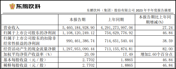 職業(yè)零售網(wǎng)獲悉,東鵬飲料發(fā)布2023年半年報顯示,實現(xiàn)營業(yè)收入54.6億元,同比增長27.24%;凈利潤11.08億元,同比增長46.84%。 公司的主營業(yè)務為飲料的研發(fā)、生產(chǎn)及銷售,主要產(chǎn)品包括東鵬特飲、東鵬大咖、東鵬補水啦、包裝飲用水等,其中東鵬特飲是公司的核心產(chǎn)品。截至2023年6月底,公司經(jīng)銷商數(shù)量達2796家,銷售終端網(wǎng)點數(shù)量達330萬家,同比增長32%。 |