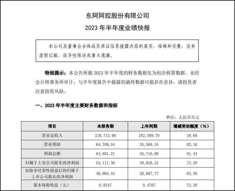 職業(yè)零售網(wǎng)獲悉,東阿阿膠發(fā)布上半年業(yè)績(jī)顯示,公司2023年半年度實(shí)現(xiàn)營業(yè)收入21.67億元,同比增長18.69%;凈利潤5.31億元,同比增長72.29%。 報(bào)告期內(nèi),公司聚焦核心業(yè)務(wù)發(fā)展,東阿阿膠塊市場(chǎng)份額明顯提升,復(fù)方阿膠漿大品種戰(zhàn)略全面落地,桃花姬阿膠糕品牌代言及渠道重塑驅(qū)動(dòng)快速增長,帶動(dòng)整體營業(yè)收入同比增幅18.69%;公司盈利能力進(jìn)一步提升,銷售毛利率穩(wěn)定增長,銷售費(fèi)用投放效率持續(xù)增強(qiáng)。受以上因素綜合影響,營業(yè)利潤、凈利潤及每股收益等指標(biāo)均大幅增長。 |