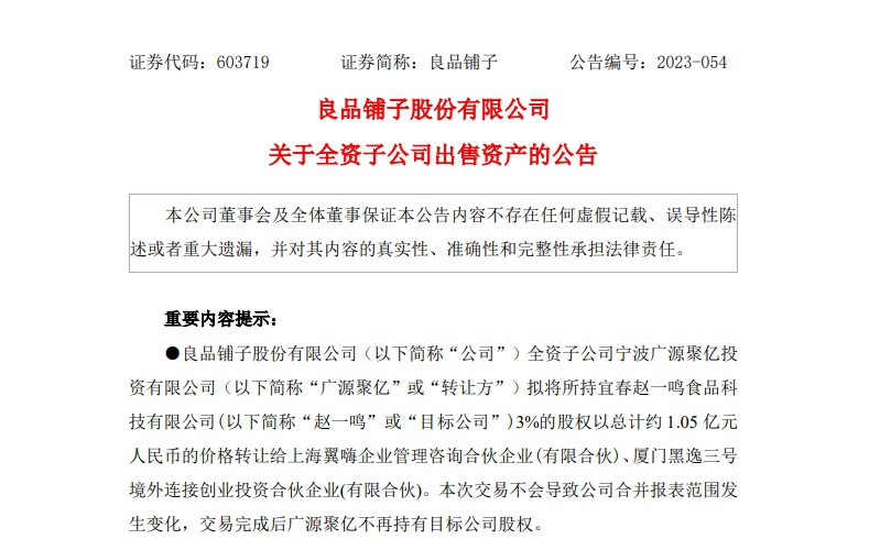 10月16日,良品鋪?zhàn)影l(fā)布公告稱,其全資子公司寧波廣源聚億投資有限公司(以下簡稱“廣源聚億”)擬將所持宜春趙一鳴食品科技有限公司(以下簡稱“趙一鳴”)3%的股權(quán)以總計約 1.05 億元 人民幣的價格轉(zhuǎn)讓給上海翼嗨企業(yè)管理咨詢合伙企業(yè)(有限合伙)、廈門黑逸三號境外連接創(chuàng)業(yè)投資合伙企業(yè)(有限合伙)。交易完成后廣源聚億不再持有趙一鳴股權(quán),在良品鋪?zhàn)雍喜蟊韺用娈?dāng)期預(yù)計產(chǎn)生約6000萬元的投資收益。今年4月,廣源聚億與趙一鳴簽訂投資協(xié)議,投資人民幣4,500萬元,持股占比3%。投資完成后,目標(biāo)公司發(fā)展迅速,當(dāng)前其門店數(shù)量較投資盡調(diào)期已增長約2倍。趙一鳴上半年營收27.86億元,凈利潤7631萬元。 |