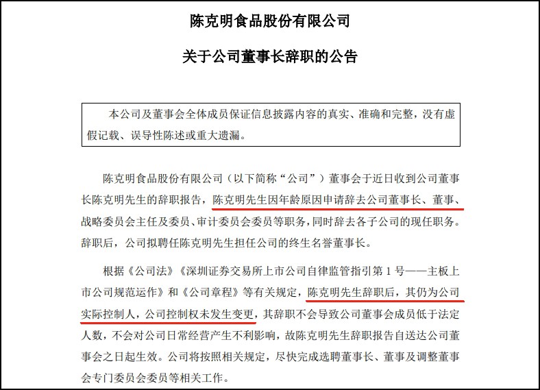 10月17日,克明食品發(fā)布公告稱,公司董事會于近日收到董事長陳克明的辭職報(bào)告,因年齡原因申請辭去公司董事長、董事、戰(zhàn)略委員會主任及委員、審計(jì)委員會委員等職務(wù),同時辭去各子公司的現(xiàn)任職務(wù)。辭職后,公司擬聘任陳克明擔(dān)任公司終生名譽(yù)董事長。 根據(jù)有關(guān)規(guī)定,陳克明辭職后,其仍為公司實(shí)際控制人,公司控制權(quán)未發(fā)生變更,其辭職不會導(dǎo)致公司董事會成員低于法定人數(shù),不會對公司日常經(jīng)營產(chǎn)生不利影響,故陳克明辭職報(bào)告自送達(dá)公司董事會之日起生效。公司將按照相關(guān)規(guī)定,盡快完成選聘董事長、董事及調(diào)整董事會專門委員會委員等相關(guān)工作。截至本公告日,陳克明持有公司股票194.43萬股。辭職后,陳克明將繼續(xù)遵守法律法規(guī)有關(guān)所持公司股份及其變動的規(guī)定。 克明食品表示,陳克明作為公司創(chuàng)始人,一直擔(dān)任公司董事長職務(wù)。未來陳克明不再參與公司的日常經(jīng)營管理,其將繼續(xù)為公司戰(zhàn)略發(fā)展、未來規(guī)劃等提供建議。 |