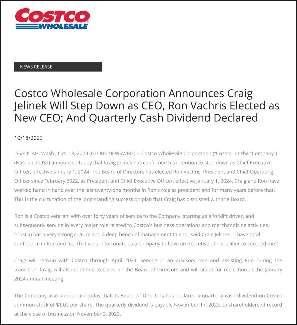 10月19日消息,美國(guó)零售巨頭開市客Costco宣布,克雷格·杰利內(nèi)克Craig Jelinek將辭去公司首席執(zhí)行官一職,他的繼任者為公司總裁兼首席運(yùn)營(yíng)官羅恩·瓦克里斯Ron Vachris。 在10月18日一份新聞稿中,開市客Costco宣布,Jelinek已確認(rèn)將辭去首席執(zhí)行官職務(wù),這一決定自2024年1月1日起生效。據(jù)透露,經(jīng)開市客董事會(huì)選舉決定,由公司首席運(yùn)營(yíng)官Ron Vachris將接任首席執(zhí)行官。 2024年4月之前,Jelinek還將在開市客擔(dān)任顧問并協(xié)助瓦克里斯完成過渡工作。此外,Jelinek還將保留公司董事會(huì)成員身份,并將在2024年1月的公司年會(huì)上競(jìng)選連任。 據(jù)彭博社報(bào)道,現(xiàn)年71歲的Jelinek自2012年1月起擔(dān)任開市客首席執(zhí)行官。在其任期內(nèi),公司股價(jià)增長(zhǎng)500%以上,收入增加一倍多。新冠疫情期間,開市客銷售額大幅增長(zhǎng)。 其繼任者瓦克里斯已在開市客工作40多年,他從叉車司機(jī)做起,隨后擔(dān)任與公司業(yè)務(wù)運(yùn)營(yíng)和銷售活動(dòng)相關(guān)的各個(gè)主要職位。從2022年2月起,Vachris擔(dān)任Costco總裁兼首席運(yùn)營(yíng)官。 資料顯示,Costco開市客是全球最大的連鎖會(huì)員制倉儲(chǔ)式超市,2019年進(jìn)入中國(guó)內(nèi)地市場(chǎng),首店位于上海閔行區(qū)。目前在全球14個(gè)國(guó)家和地區(qū)擁有超過861家門店,其中在中國(guó)大陸有5家門店,分別為上海閔行店、上海浦東店、蘇州店、寧波店和杭州店。 今年以來,Costco開市客已經(jīng)新開了三家門店,分別是上海浦東店、寧波店以及杭州店。 此前,“Costco開市客”官方微信公眾號(hào)宣布,深圳店將于2024年1月正式開業(yè)。據(jù)悉,Costco開市客深圳店為華南首店,位于龍華區(qū)新區(qū)大道617號(hào),總面積4.45萬平方米。 目前,商場(chǎng)主體建筑已大致完成,正加快工程建設(shè)和開業(yè)準(zhǔn)備工作。與此同時(shí),會(huì)員線上辦卡優(yōu)惠已經(jīng)開始,并開啟會(huì)員部、生鮮部、商品部等多個(gè)部門的職位招聘。 按計(jì)劃,Costco開市客將于2024年5月亮相南京店,這樣這意味著,Costco開市客于明年上半年。其在全國(guó)至少擁有7家門店。Costco開市客亞洲區(qū)總裁張嗣漢表示,未來,Costco開市客將持續(xù)深耕中國(guó)大陸市場(chǎng)。 根據(jù)中國(guó)連鎖經(jīng)營(yíng)協(xié)會(huì)發(fā)布的《2022年中國(guó)超市TOP100》榜單顯示,Costco開市客以30億銷售額,2家門店入選總榜單第48位,這也是Costco開市客首次上榜。根據(jù)該榜單銷售額計(jì)算,Costco平均每家門店銷售高達(dá)15億元。 |